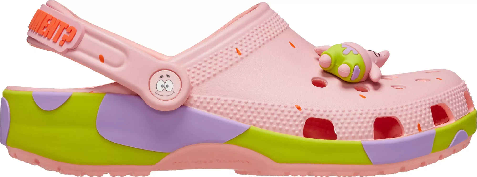 Design: Exclusive Patrick Star printed design nkle strap text “Is mayonnaise an instrument?” Water-friendly and buoyant; weighs only ounces Incredibly light and fun to wear Ventilation ports add breathability and help shed water and debris Printed Patrick face on interior footbed Easy to clean and quick to dry Pivoting heel straps for a more secure fit Iconic Crocs Comfort™: Lightweight. Flexible. 360-degree comfort Additional Details: Patrick Star themed Jibbitz™ charms © 2024 Viacom. SpongeBob SquarePants created by Stephen Hillenburg