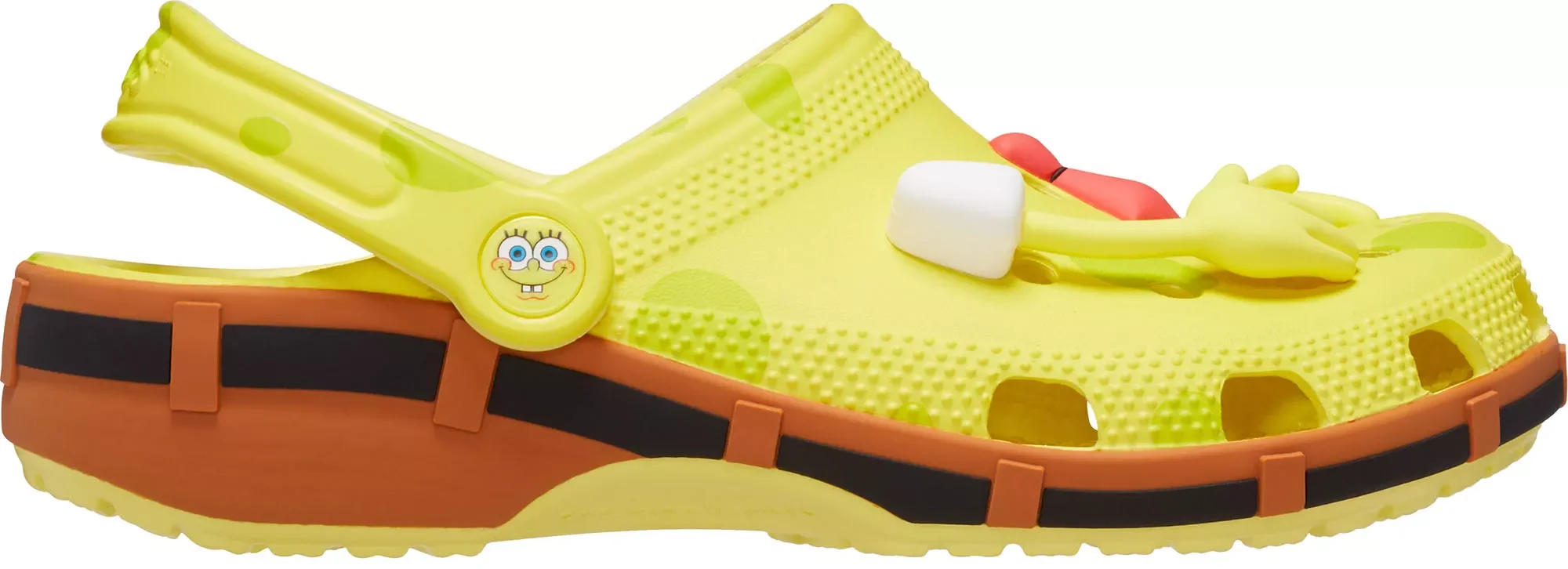 Design: Exclusive SpongeBob printed design Water-friendly and buoyant; weighs only ounces Incredibly light and fun to wear Ventilation ports add breathability and help shed water and debris Printed SpongeBob face on interior footbed Easy to clean and quick to dry Pivoting heel straps for a more secure fit Iconic Crocs Comfort™: Lightweight. Flexible. 360-degree comfort Additional Details: Posable arms Jibbitz™ charms © 2024 Viacom. SpongeBob SquarePants created by Stephen Hillenburg