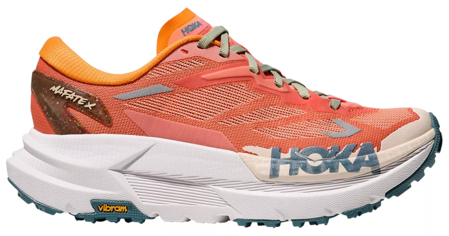 Calling all trail racing fiends, gravel grinders, and 100-milers. Theres a new trail titan in town. Built for long-haul efforts, the Mafate X delivers supreme plushness with a dual-density, premium foam chassis, PEBA top layer, and a pop of propulsion thanks to the forked carbon fiber plate. Design: Woven textile upper Rearfoot-focused Active Foot Frame™ Early-stage Meta-Rocker promotes a smooth stride In-Shoe Comfort: Super critically foamed EVA carrier midsole Forked carbon fiber plate adds propulsion and stability Dual-density, premium foam chassis for maximum cushioning Durability & Traction: Vibram™ Megagrip outsole with 3.5mm lug depth for unparalleled traction Additional Details: Vegan Weight (size 8): 10.3 oz