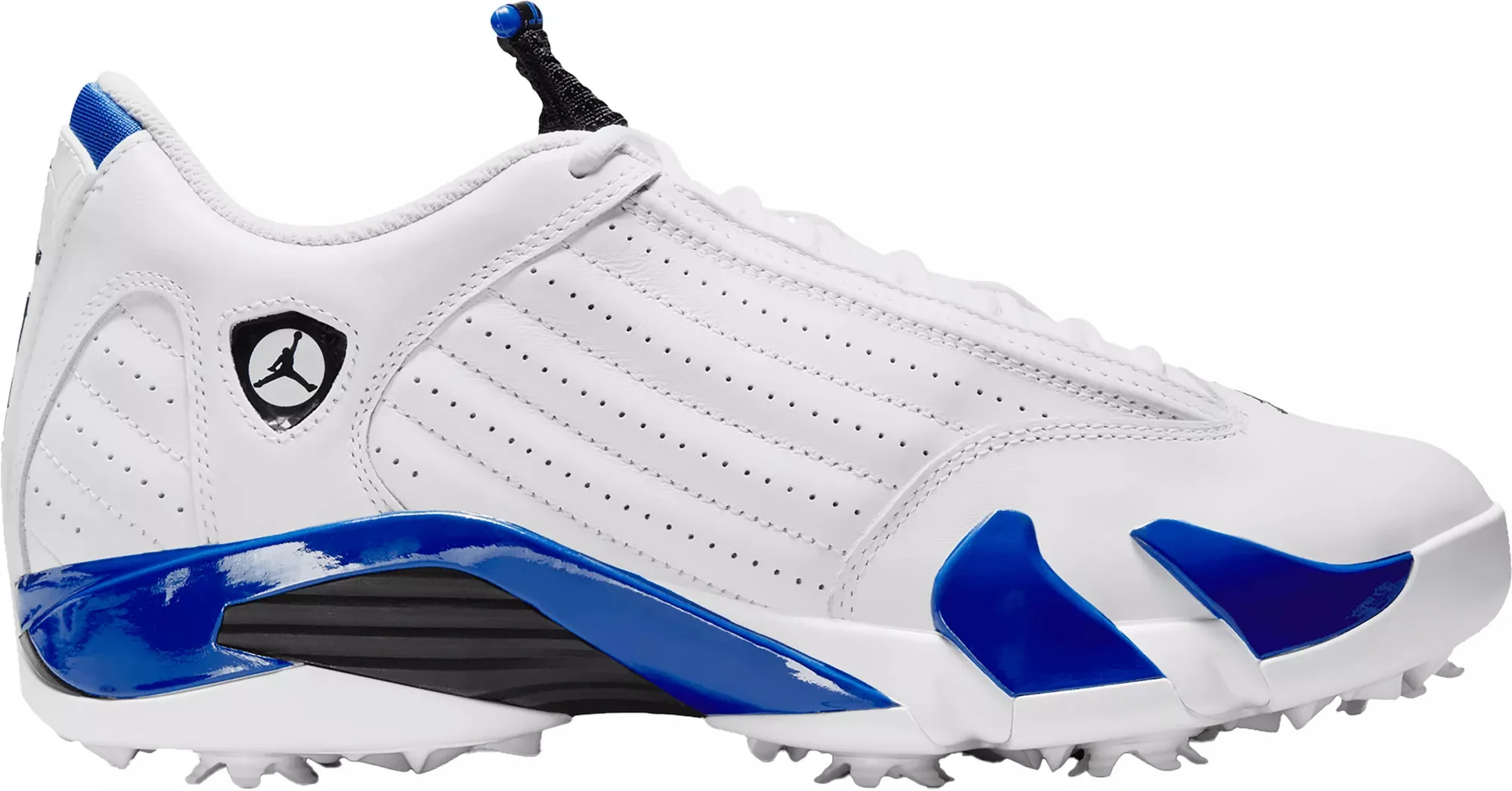 A timeless classic remixed for the course—meet the Air Jordan 14 G. Air Zoom units in the forefoot and heel help provide comfortable cushioning for every swing and step. For support and traction, we stabilized the midsole and added seven removable spikes to the outsole plate. DESIGN: Genuine leather upper delivers elevated look Closed seams help keep water out IN-SHOE COMFORT: Air Zoom units in heel and forefoot provide responsive cushioning Soft foam collar offers ideal height and support for all-day wear Midsole features soft foam for comfort Insole made with memory foam for personalized feel DURABILITY & TRACTION: Seven removable spikes and secondary traction inspired by original AJ14 enhance grip Stable forefoot and midfoot deliver solid underfoot ride