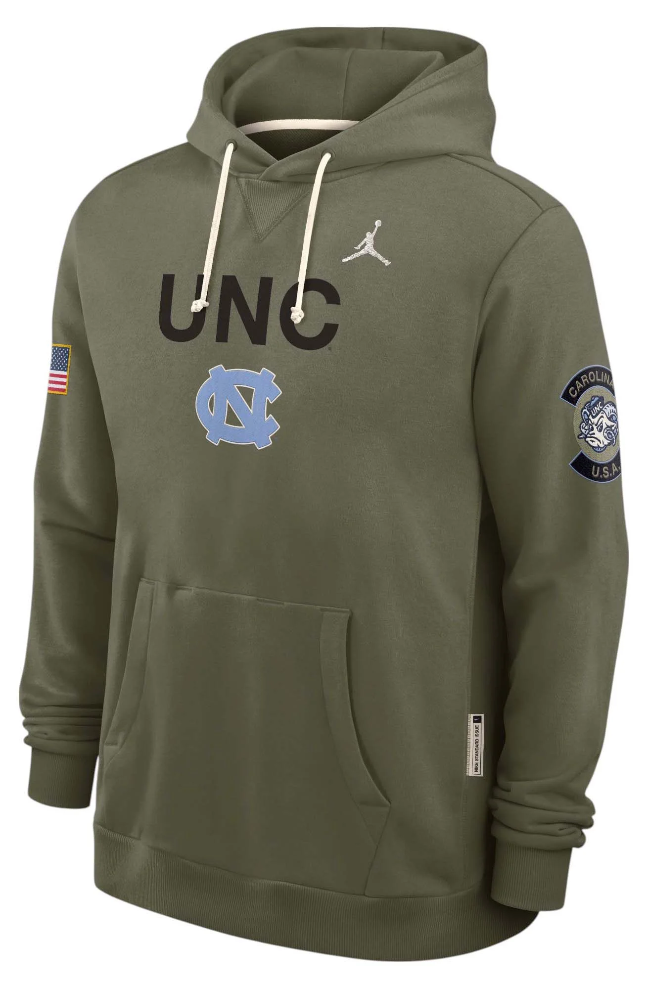 Show your appreciation for the military while representing your favorite team Design Long sleeve, hooded sweatshirt Front kangaroo pocket Adjustable drawcord Brushed fleece is soft and cozy Standard fit Style and Team Spirit Screen-printed military styled wordmark at center chest Screen-printed team logo below wordmark Jumpman™ design trademark detail Technology Dri-FIT® fabric keeps you cool and dry Additional Details Machine washable Officially licensed collegiate product