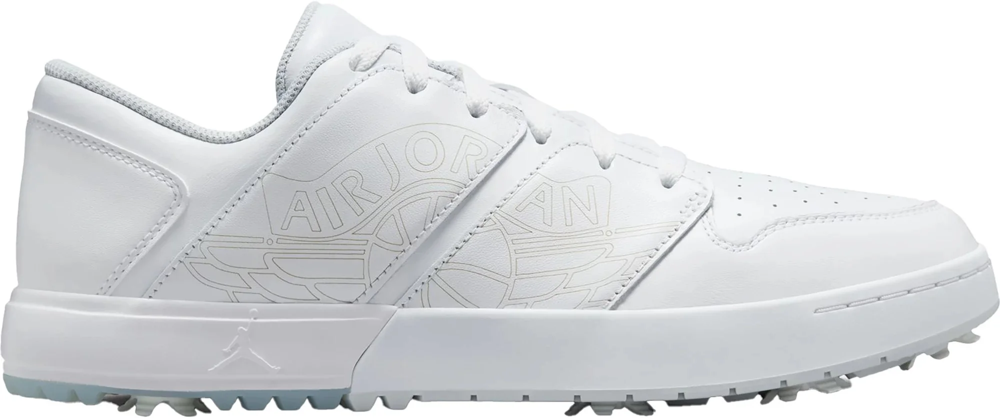 An instant classic on the course, the Jordan NU Retro 1 G melds iconic Jordan style with our latest golf technology. A rubber heel and durable plastic forefoot plate help give you stability and comfortable cushioning. Seven removable spikes add traction, so you're ready for swift swings and walking the course. DESIGN: A mix of real and synthetic leather in the upper helps add durability and structure IN-SHOE COMFORT: Added an Air unit to the heel to help give you stability and stiffness without loosing out on comfortable cushioning Foam grip heel and robust tongue provide all day comfort Midsole is made of an upgraded soft foam DURABILITY & TRACTION: Seven removable spikes and secondary traction for ultimate grip Midboot band provides an ideal amount of lateral support Solid plastic forefoot plate with a rubber heel