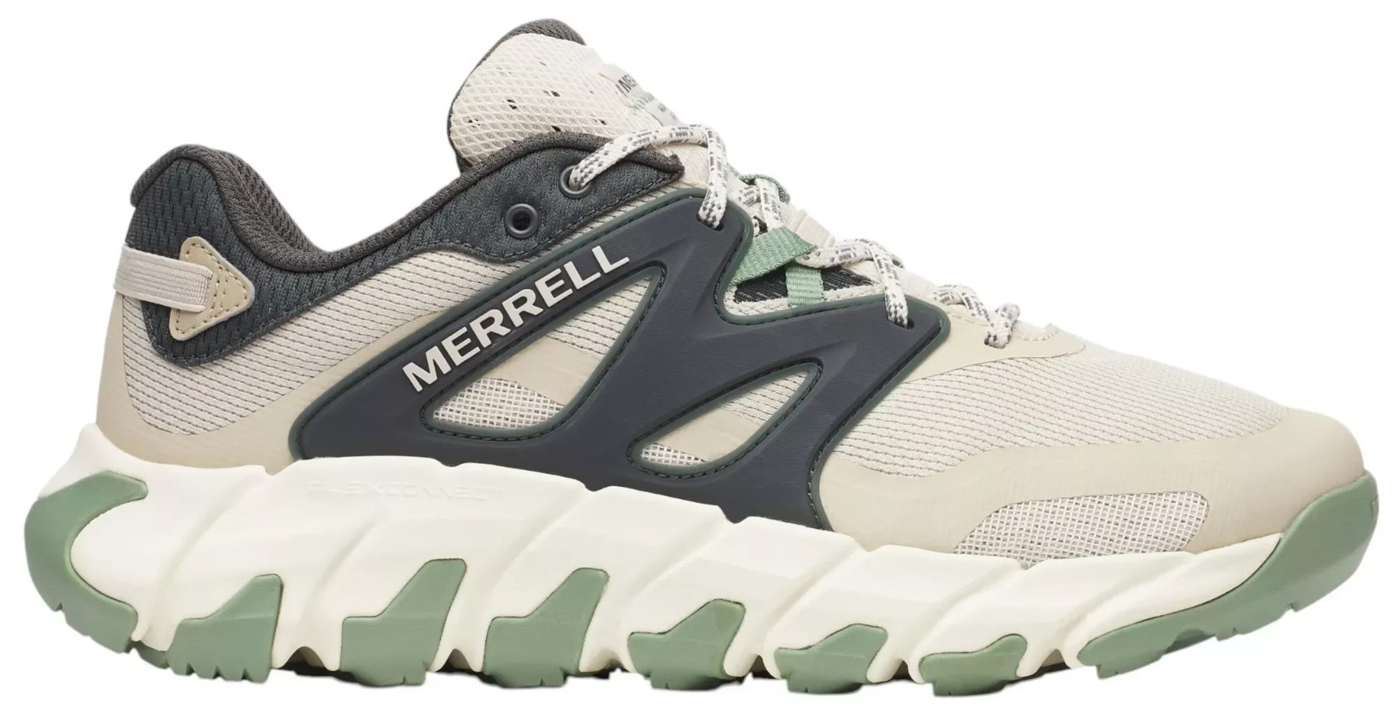 FEATURES: Synthetic and mesh upper 100% recycled laces Bellows tongue keeps out debris 100% recycled eyestay webbing 100% recycled elastic heel pull tab webbing 100% recycled elastic lace keeper 100% recycled breathable mesh lining Removable EVA foam footbed FLEXconnect® dual-directional flex-grooves in the midsole for enhanced ground connection Lightweight EVA foam midsole for stability and comfort Merrell sticky rubber outsole with durable traction that grips when and where you need it