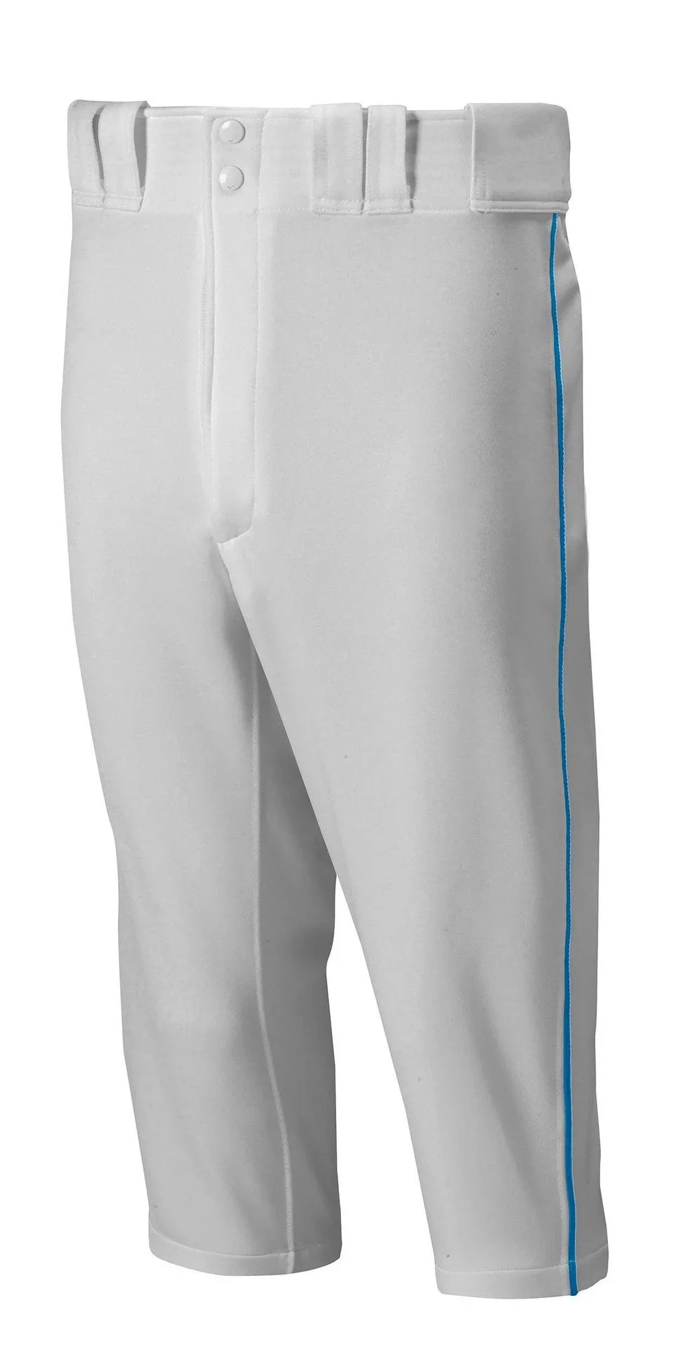 Get the classic baseball look with the Mizuno® Men’s Premier Short Piped Baseball Pants. These short pants are worn just below the knee with an elastic bottom to hold them in place. Stay cool and in the game with the double knit lightweight fabric that keeps you comfortable and holds up to the rigors of the game. Design Details Shorter inseam - just below the knee Two set-in back pockets with button closure Tunnel-belt-loop waist Double knee Fly front with extended two-snap closure Elastic bottom Fabric: 100% Polyester Double Knit