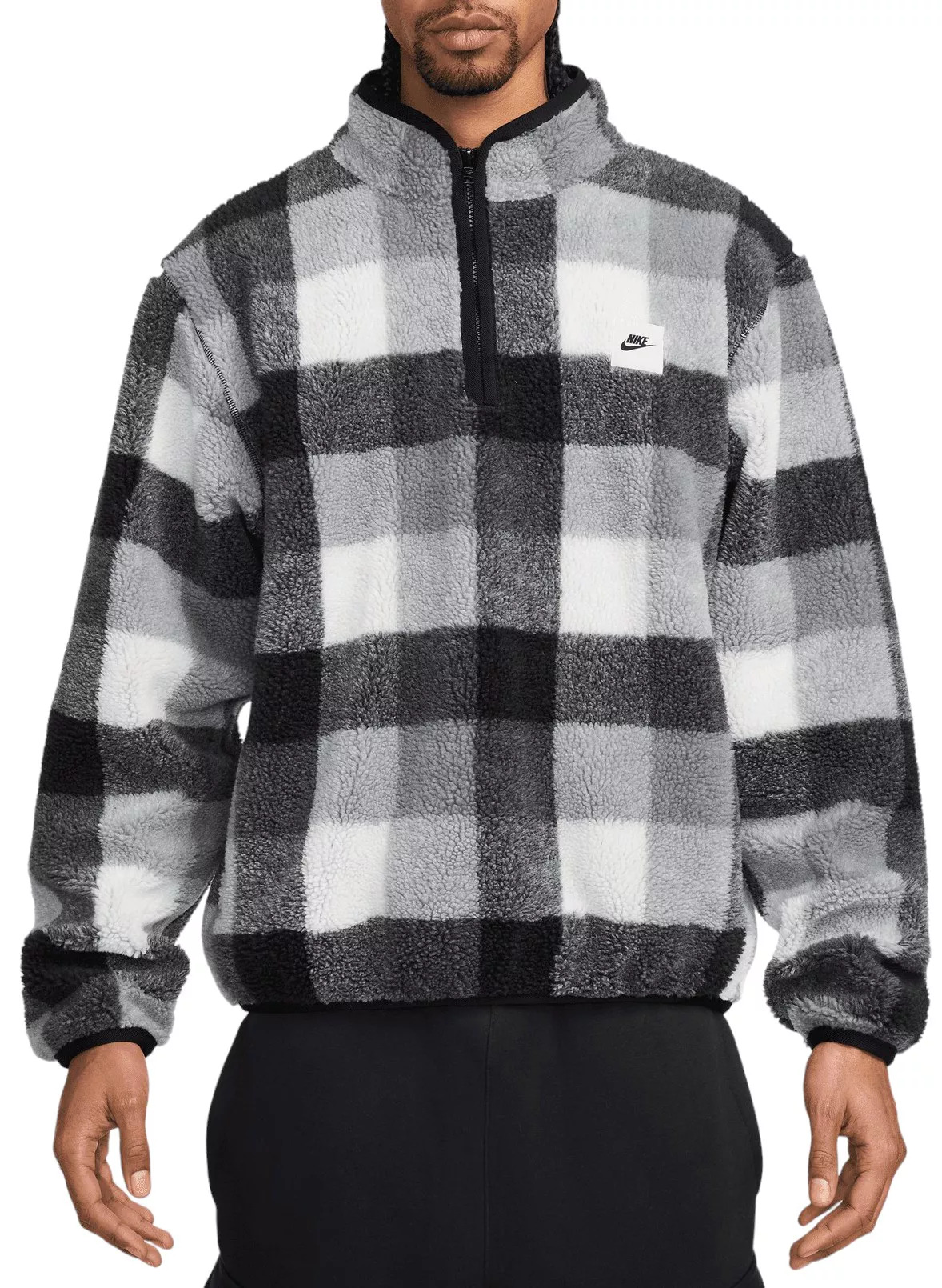 Transition your wardrobe to the winter with this Sherpa upgrade to a Nike Club classic. The relaxed silhouette and holiday-ready plaid combine with Nike Therma-FIT technology to become a new cold-weather favorite. Fit & Design Relaxed fit jacket The silhouette is designed to feel roomy through the chest, body and sleeves for easy movement and layering High neck with 1/2 zip Sleeveless Side zipper pockets with internal kangaroo pocket secure your essentials Canvas Nike Futura logo and embossed zipper pull give the top a branded finish Technology Nike Therma-FIT technology helps manage your body’s natural heat to help keep you warm in cold-weather conditions Additional Details Machine wash