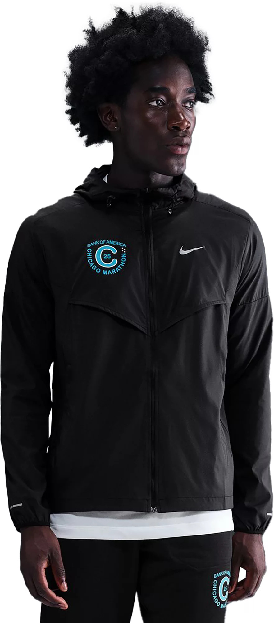 This ultralight jacket celebrates the 2025 Chicago Marathon. It's built for unpredictable weather, with a lightweight, water-repellent design that packs away when the skies clear. Fit & Design: Standard fit Full-length zipper Hood with a bungee cord Vent at the back keeps air flowing while you're on the move Mesh panels under the arms provide extra breathability Zippered pockets allow you to securely store essentials Reflective Swoosh Reflective elements Packs down into its own internal pocket when you're ready to lose a layer Technology: Two-way stretch fabric is super lightweight and water-repellent, helping you stay dry in wet weather Product provides UVA and UVB protection from the sun in the areas covered by the garment Additional Details: Machine wash Imported