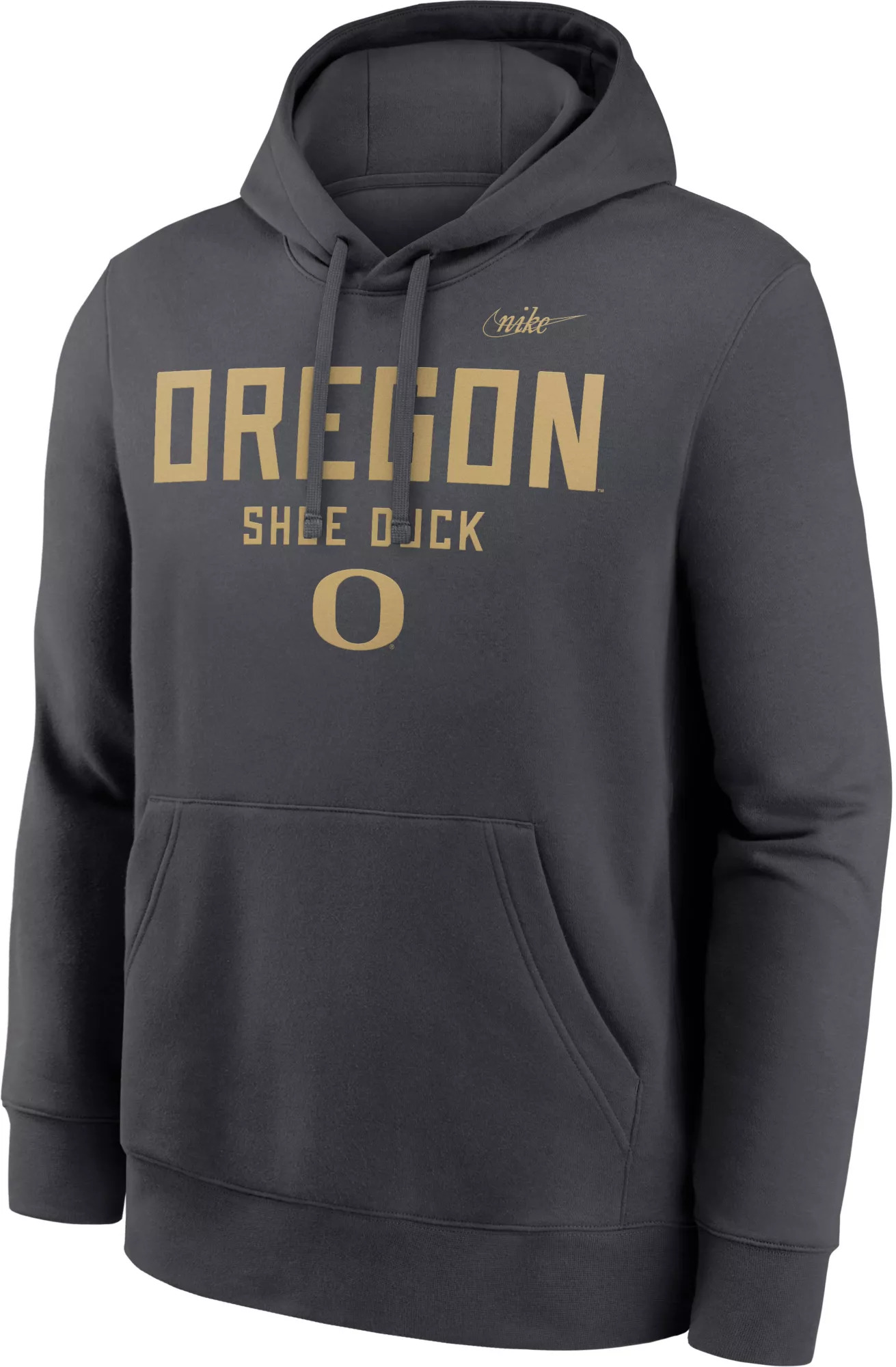 It began with a handshake, an unspoken promise between Phil Knight and Bill Bowerman that sparked a revolution in sport and style. The Shoe Duck Collection pays tribute to that iconic moment, capturing the spirit of innovation born at the University of Oregon. With exclusive graphics immortalizing the legendary handshake, each piece in this collection is a love letter to Nike’s origin story. The name “Shoe Duck” draws inspiration from the cover of Knight’s memoir, Shoe Dog—a nod to the journey, the grit, and the dream that took flight. Details Long sleeve, hooded sweatshirt Front kangaroo pocket Adjustable drawcord Brushed fleece is soft and cozy Standard fit Style and Team Spirit Screen-printed team logo at center chest Swoosh™ design trademark Additional Details Machine washable Officially licensed product
