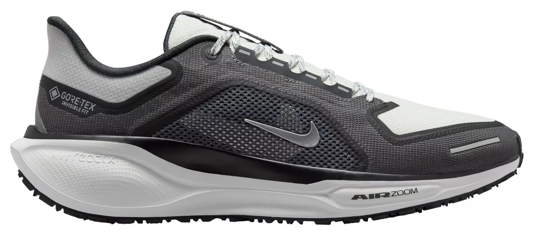 Design: Waterproof GORE-TEX upper and technical mesh help keep water out so your feet dry Heathered material around the collar helps keep your ankle warm MR-10 Last for a consistent fit (same as Pegasus 40) Reflective GORE-TEX logo and Swoosh logo Reflective graphics and overlays Plush collar, tongue and sockliner In-Shoe Comfort: ReactX foam midsole surrounds forefoot and heel Air Zoom units for an energized ride All-new ReactX foam midsole is 13% more responsive than previous React technology Durability & Traction: Storm-Tread outsole provides traction in wet weather Additional Details: Weight: Approx. 297 g/10.4 oz (Men's US 10) Heel-to-toe drop: 10 mm