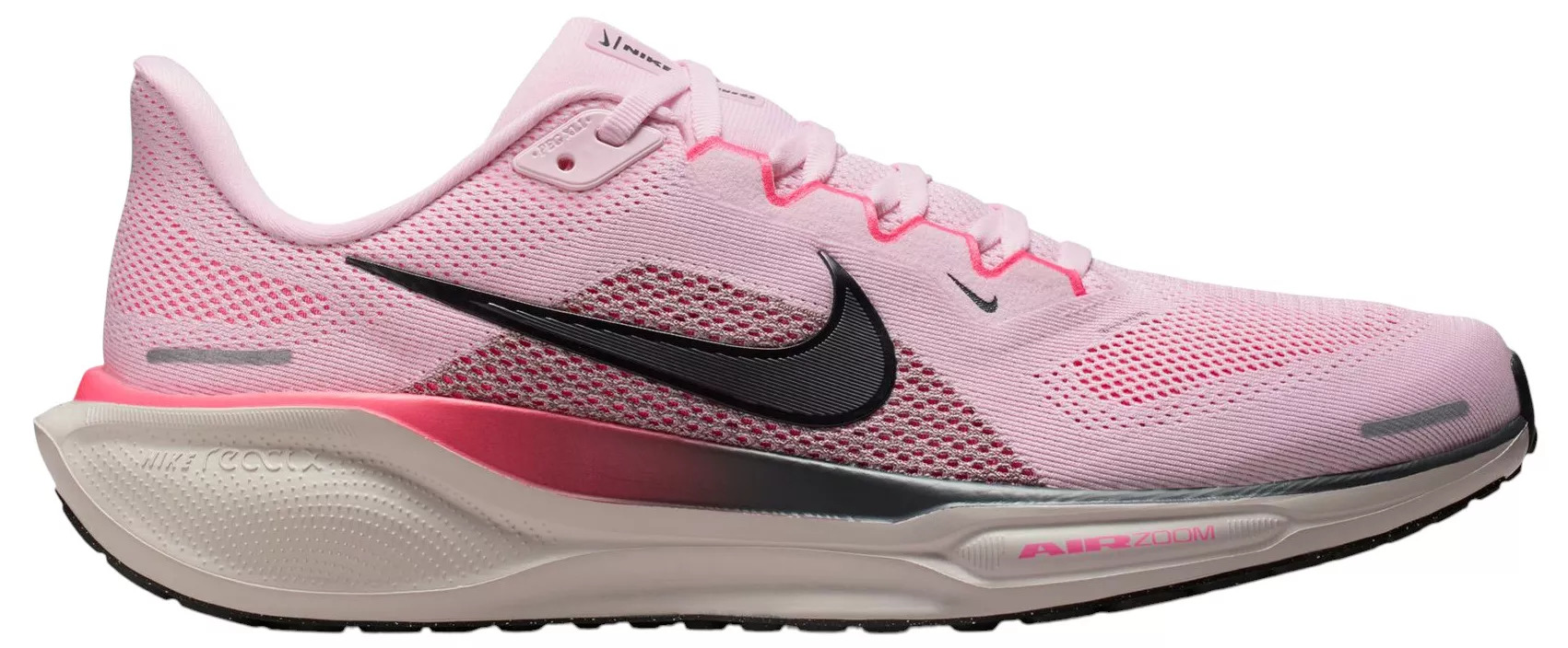 Experience the ultimate combination of comfort and performance with the men's Pegasus 41 running shoes. Featuring an upgraded breathable engineered mesh upper and an all-new ReactX foam midsole, these shoes are designed to provide an energized ride with increased breathability and reduced weight. The signature waffle-inspired rubber outsole ensures exceptional traction and flexibility, making them perfect for road running. Design: Upgraded breathable engineered mesh upper Improved engineered mesh on the upper decreases weight and increases breathability Plush collar tongue and sockliner for a secure and comfortable fit MR-10 Last for a consistent fit (same as Pegasus 40) In-Shoe Comfort: ReactX foam midsole surrounds forefoot and heel Air Zoom units for an energized ride All-new ReactX foam midsole is 13% more responsive than previous React technology Durability & Traction: Signature waffle-inspired rubber outsole for traction and flexibility Additional Details: ReactX foam is engineered to reduce its carbon footprint by at least 43% in a pair of midsoles due to reduced manufacturing process energy compared to prior React foam Weight: Approx. 297 g/10.4 oz (Men's US 10) Heel-to-toe drop: 10 mm
