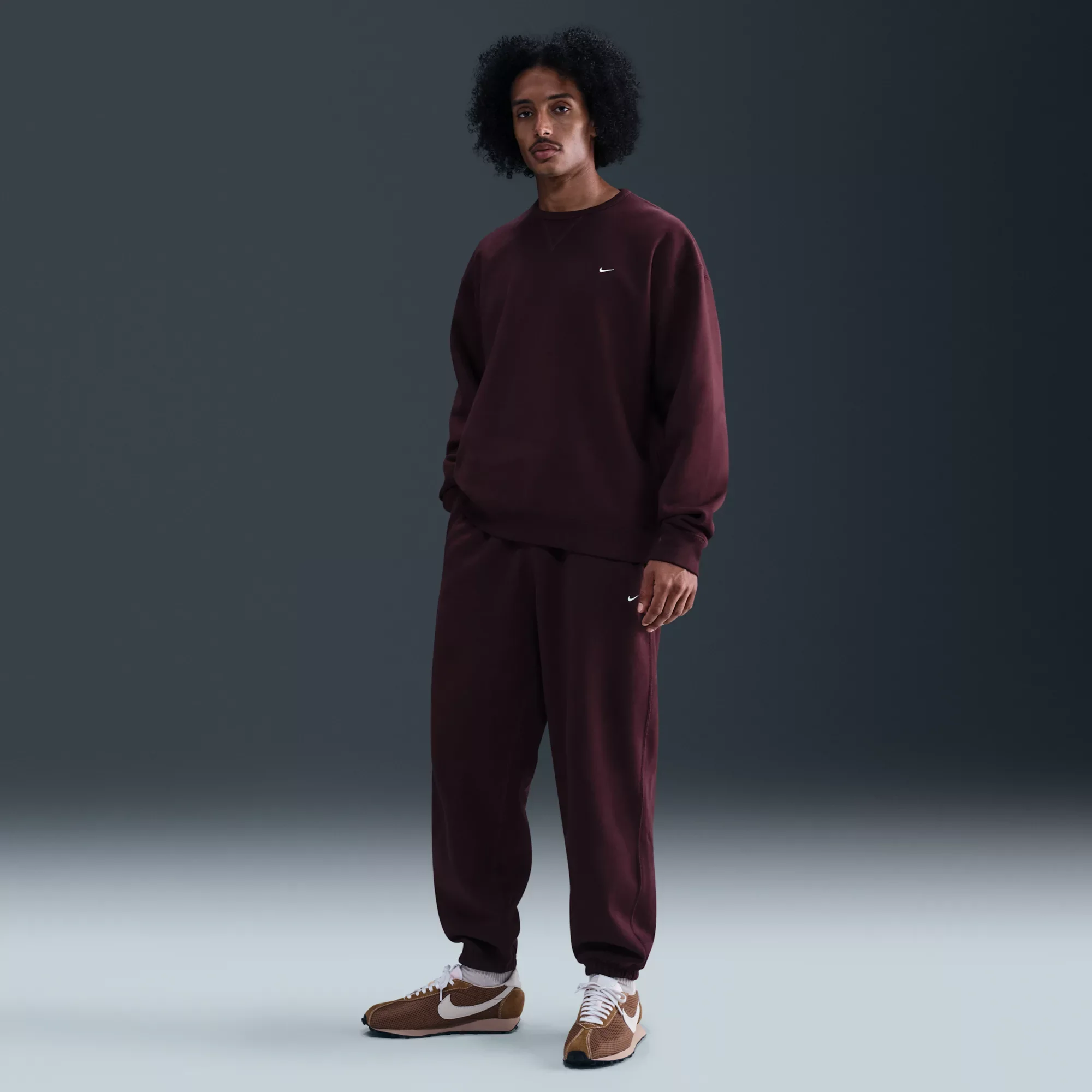 Warm and structured, these pants are crafted with a heavyweight brushed fleece that feels plush on the inside and smooth on the outside, bringing a touch of luxury to your casual, cool-weather layers. Fit & Design Loose fit Elastic waistband has an internal drawcord to let you find the right fit Soft and stretchy elastic cuffs rest above your shoes Embroidered Nike Swoosh logo Additional Details: Material percentages may vary; check label for actual content