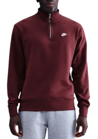 Clean meets casual with this classic half-zip top. The standard fit feels relaxed through the body. Fit & Design: Standard fit half-zip sweatshirt Midweight brushed fleece feels extra soft on the inside and smooth on the outside, helping you stay cozy while keeping its structured shape Collared Ribbed hem and cuffs 1/2 zip closure Embroidered Nike logo Additional Details: Machine wash Imported