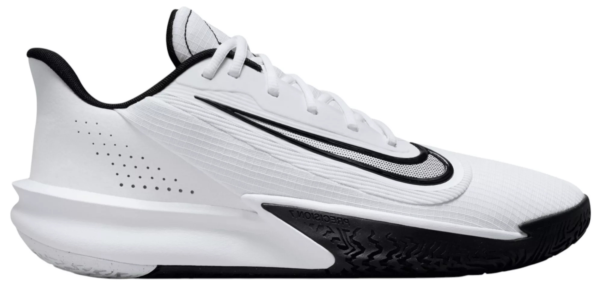 Score at will at the rim or from deep in the Nike Precision 7. Crafted with a combination of ground control, comfort and on-court traction, it's perfect for instant impact plays when your name is called for the next pickup game. Check in and make the plays that swing the outcome in your favor. Design Plush foam on the collar and tongue enhances the feeling of comfort around the ankle and over the top of the foot—areas where you want no distractions Breathable mesh upper keeps you contained Low collar provides mobility at the ankle Visible cutout in the foam helps reduce weight In-Shoe Comfort The sculpted foam midsole feels soft and supportive, providing cushioning for the game's nonstop movement Durability & Traction Herringbone traction provides multidirectional grip, great for players who rely on their quickness and cutting ability The rubber wraps up the sides in the forefoot to give you traction on your edges Additional Details: Product shown in Men's and Women's sizes Example: M7.5/W9.0 = Men's size 7.5, Women's size 9.0