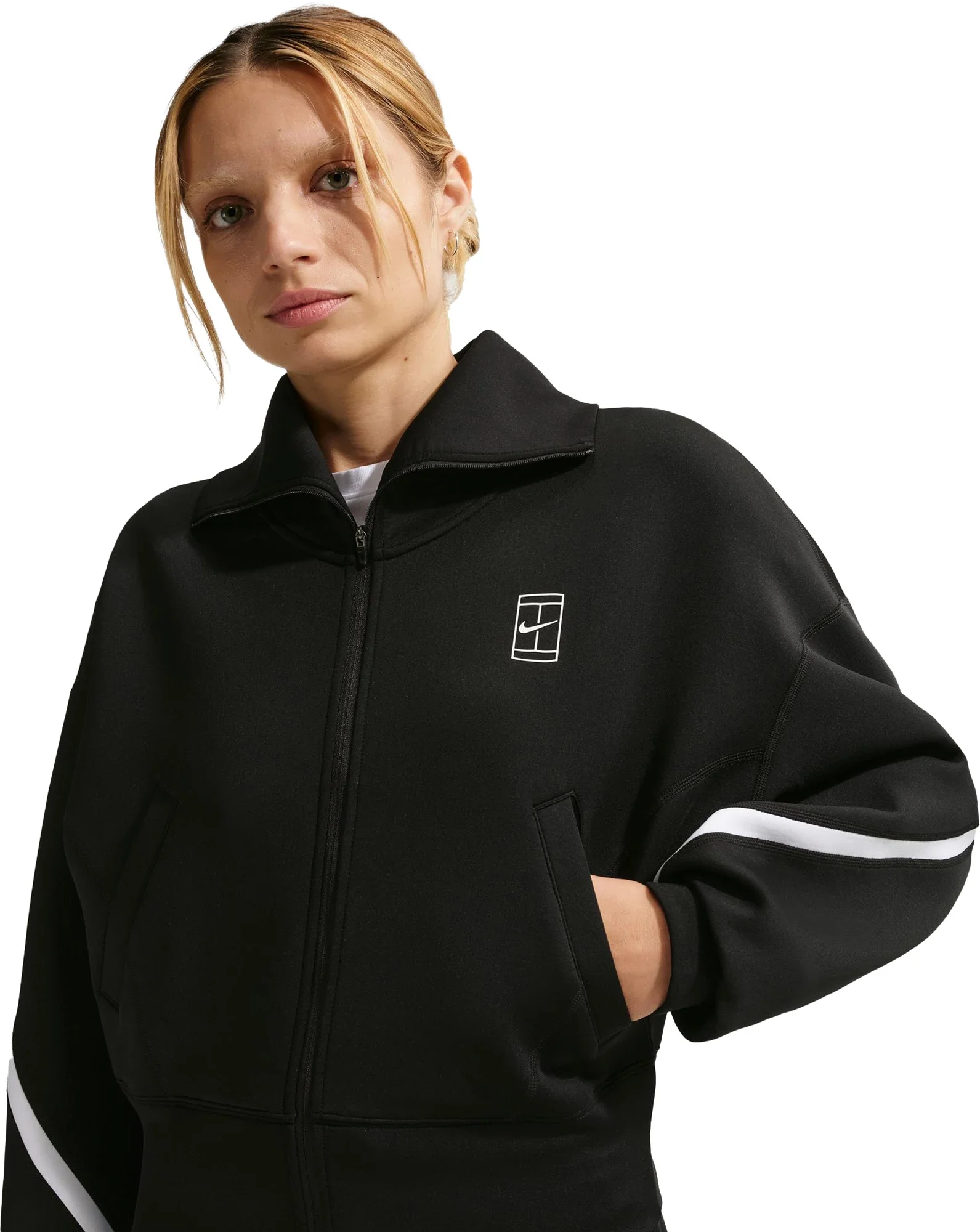 Ready for the press tent, this jacket reimagines classic warm-ups for today's best tennis players. Made with a sweat-wicking, midweight fabric, it offers versatile warmth so fielding those tough questions is no sweat. Fit & Design: Long sleeve Full-zip design is perfect for layering Irresistibly smooth and sleek, this premium fabric feels soft and airy, with the perfect amount of flex and stretch for all of your moves Dropped shoulders Technology: Nike Dri-FIT technology moves sweat away from your skin for quicker evaporation, helping you stay dry and comfortable Additional Details: Machine wash