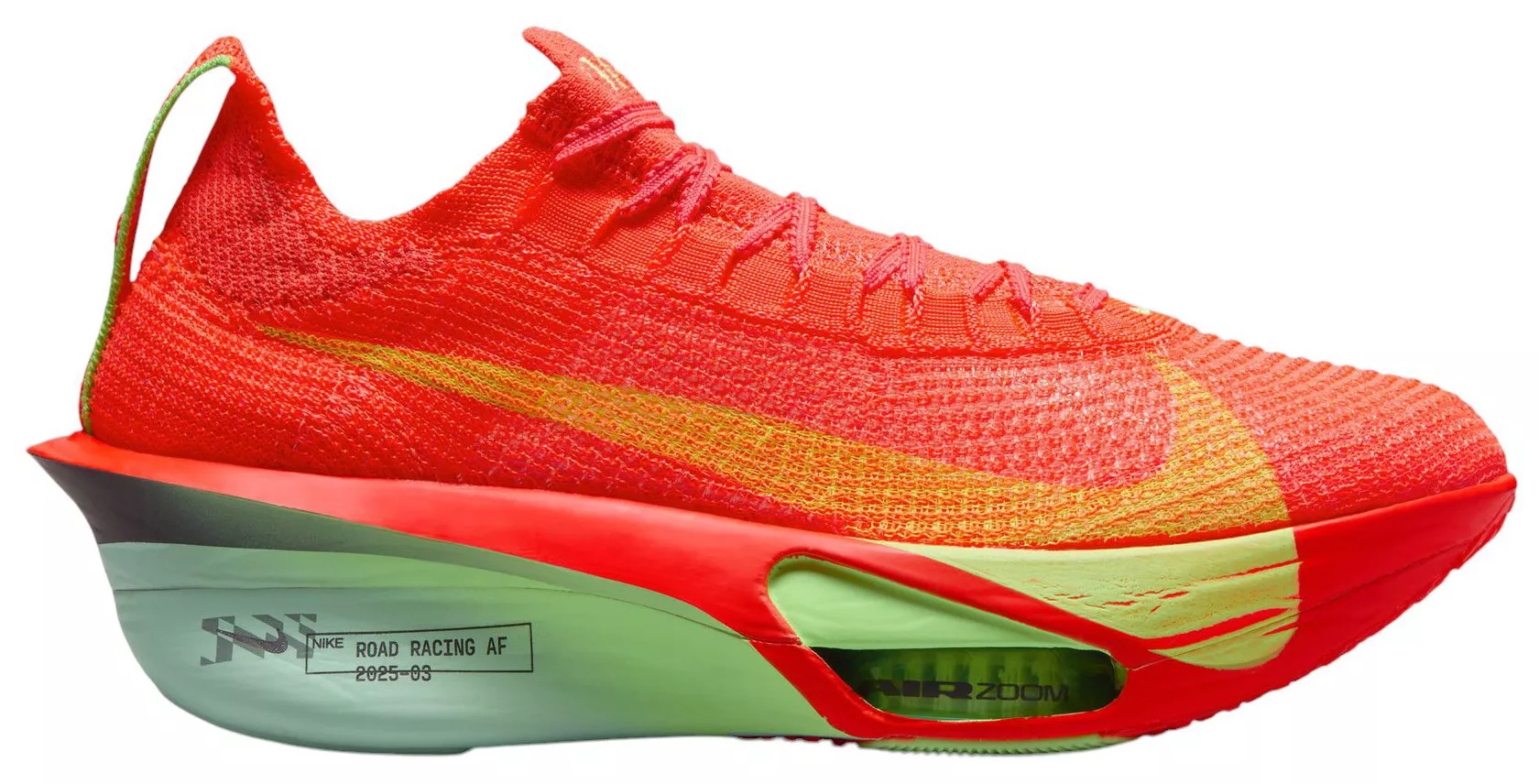 Fine-tuned for marathon speed, the Alphafly 3 helps push you beyond what you thought possible. Three innovative technologies power your run: A double dose of Air Zoom units helps launch you into your next step; a full-length carbon fiber plate helps propel you forward with ease; and a heel-to-toe ZoomX foam midsole helps keep you fresh from start to 26.2. Time to leave your old personal records in the dust. Design: All-new Atomknit upper designed for improved multidirectional containment and breathability Full-length carbon fiber plate delivers a propulsive sensation Notched laces offer a secure but soft lace-up In-Shoe Comfort: Integrated knit tongue with lofted padding helps alleviate lace pressure Two forefoot Air Zoom units combine with ZoomX foam to store and return the energy back to you, powering every step Fully connected ZoomX foam creates an ultralight and cushioned feel, helping you stay fresh and comfortable from mile 1 to 26.2 Additional Details: Weight: 174g / 6.1 oz (Women’s size 8) Heel-to-toe drop: 8mm