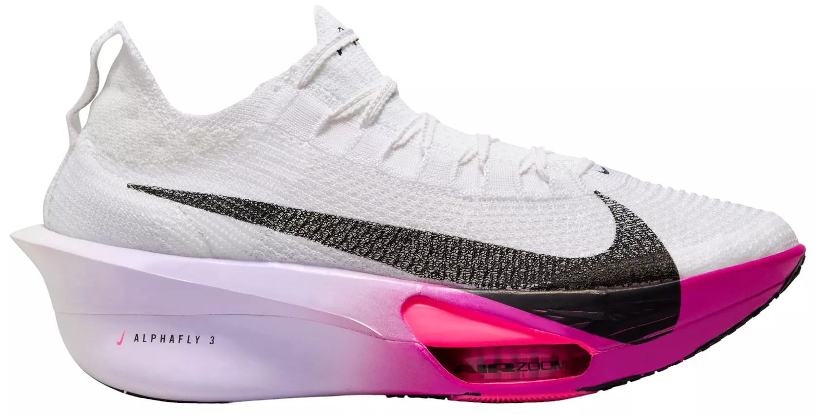 Fine-tuned for marathon speed, the Alphafly 3 helps push you beyond what you thought possible. Three innovative technologies power your run: A double dose of Air Zoom units helps launch you into your next step; a full-length carbon fiber plate helps propel you forward with ease; and a heel-to-toe ZoomX foam midsole helps keep you fresh from start to 26.2. Time to leave your old personal records in the dust. Design: All-new Atomknit upper designed for improved multidirectional containment and breathability Full-length carbon fiber plate delivers a propulsive sensation Notched laces offer a secure but soft lace-up In-Shoe Comfort: Integrated knit tongue with lofted padding helps alleviate lace pressure Two forefoot Air Zoom units combine with ZoomX foam to store and return the energy back to you, powering every step Fully connected ZoomX foam creates an ultralight and cushioned feel, helping you stay fresh and comfortable from mile 1 to 26.2 Additional Details: Weight: 174g / 6.1 oz (Women’s size 8) Heel-to-toe drop: 8mm