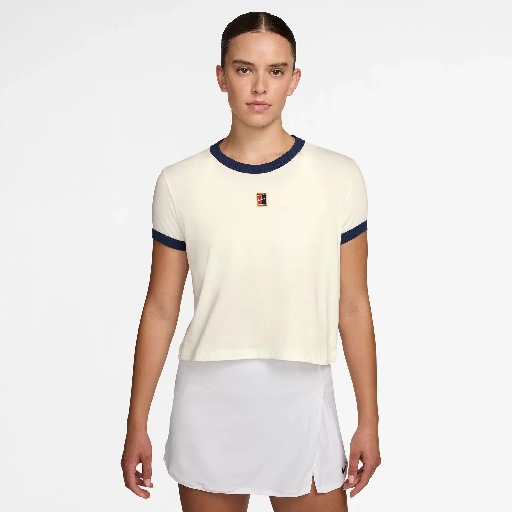 Fit & Design: Short sleeve Crewneck Slightly cropped design has a classic fit for the right amount of room Everyday cotton fabric feels soft and lightweight Ribbed neckline and cuffs Features Nike Racquet Club graphic on back and embroidery on front Additional Details: Machine wash