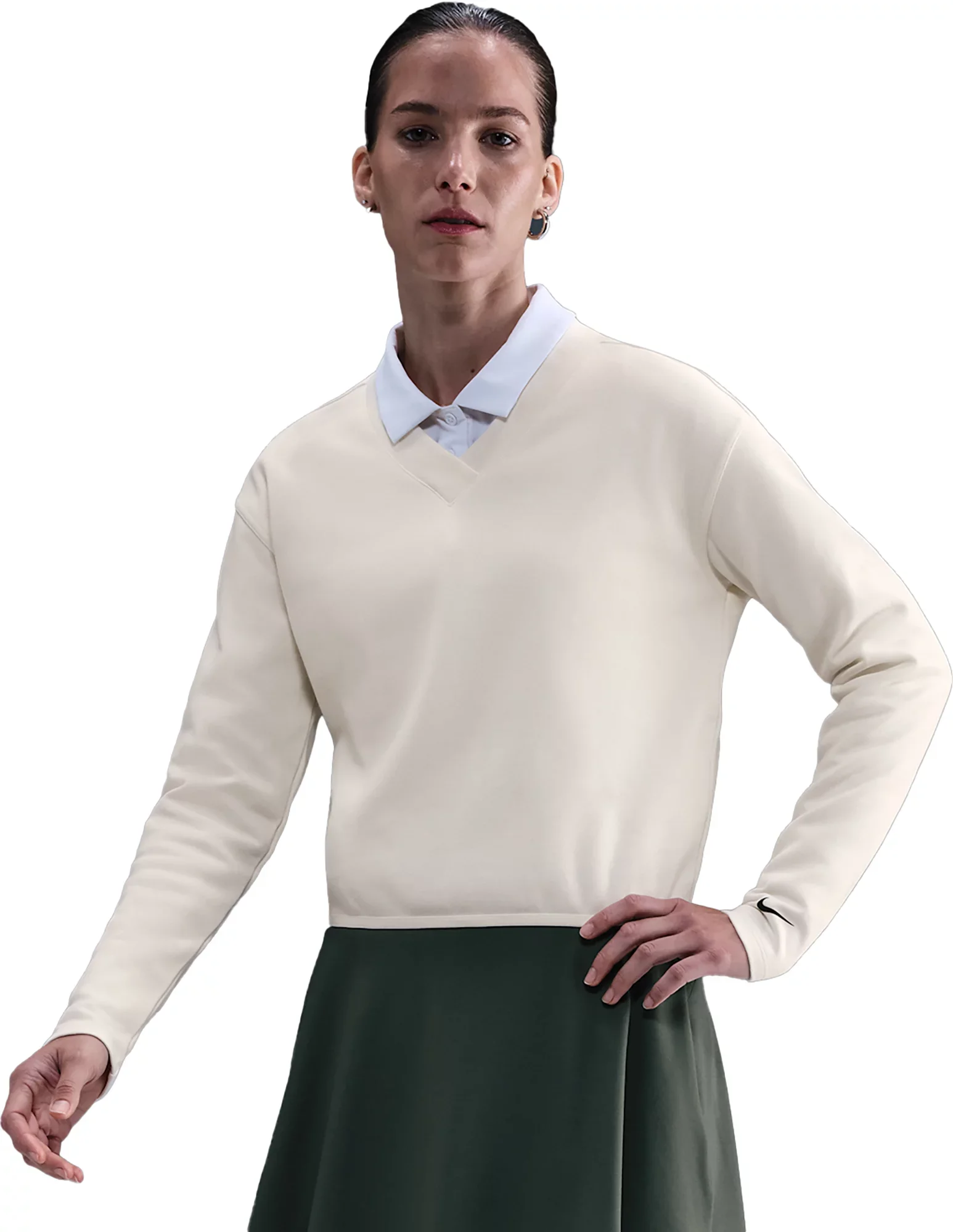 The timeless design of a V-neck golf sweater gets a modern update with taping at the hem for a slightly cropped feel and a fresh golf look. Its soft pique fabric is lightweight and easy to layer. Some stretch means it'll never slow down your swing. Fit & Design: Long sleeve V-neck Taping at the hem Slightly cropped feel Lightweight soft, pique fabric Stretch for full range of motion in your swing Additional Details: Machine wash