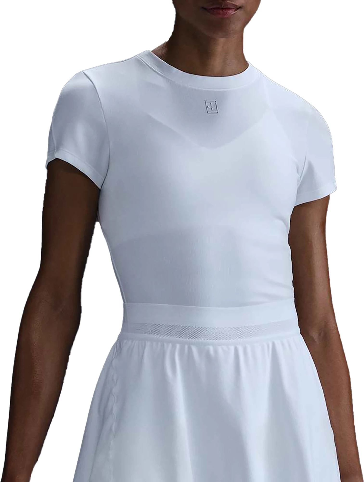 Soft and sweat wicking, this ribbed top stretches with you as you run the court. A tailored fit combines with a high neckline to help keep you covered in all your stances. Fit & Design: Short sleeve Crewneck Tailored fit Ribbed fabric feels smooth and sleek on the inside Soft and stretchy Technology: Nike Dri-FIT technology moves sweat away from your skin for quicker evaporation, helping you stay dry and comfortable Additional Details: Machine wash