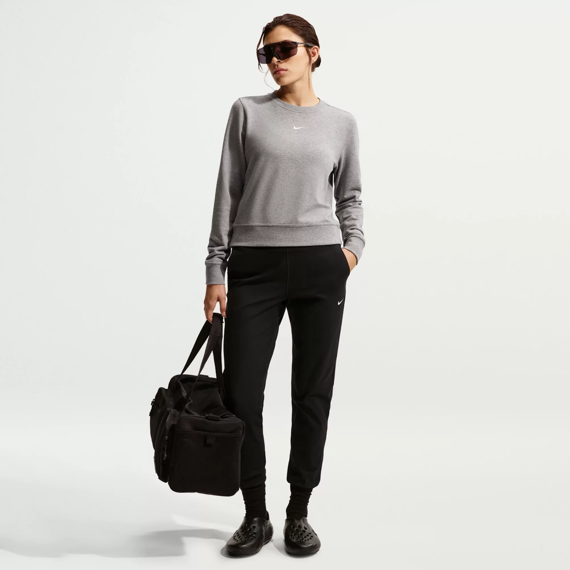 Whether its leg day or rest day, stay comfortable all-day in these sweat-wicking joggers. Midweight, peachy-soft fabric stretches with every move and the high-waisted fit provides additional coverage. Fit & Design: Standard fit: easy and traditional Full length: hits below ankle Midweight, peachy-soft fabric stretches with your every move and dries quickly Side pockets Elastic waistband and cuffs Technology: Nike Dri-FIT technology moves sweat away from your skin for quicker evaporation, helping you stay dry and comfortable Additional Details: Made from recycled materials