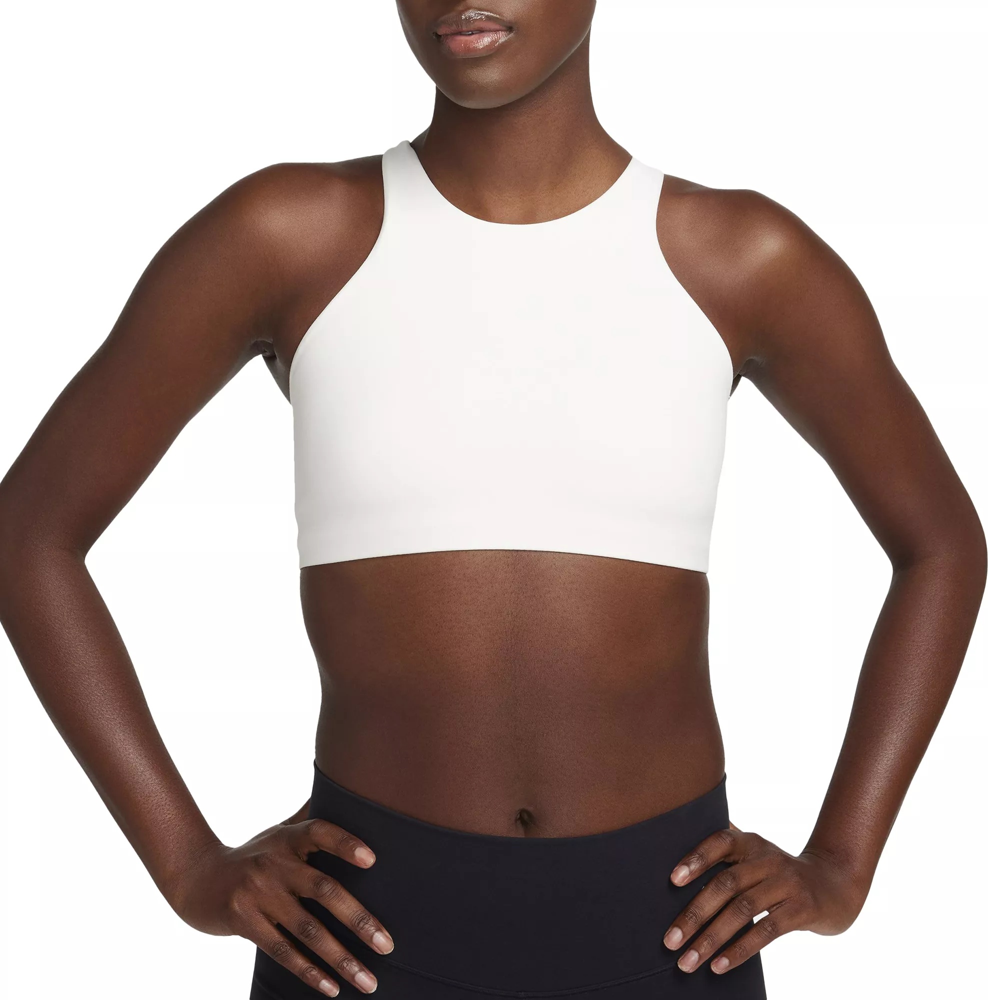 Up for a workout or down to chill, this high-neck bra is ready for whatever your day has in store. Its midweight, peachy-soft fabric stretches with your every move and dries quickly, while medium support gives you a snug hold that helps keep everything in place. Plus, the lightweight, sewn-in spacer lining feels breathable while still giving you plenty of coverage. Fit & Design: Nike Dri-FIT technology moves sweat away from your skin for quicker evaporation, helping you stay dry and comfortable Keyhole back design invites plenty of airflow Fabric-covered bottom band helps reduce pinching and binding