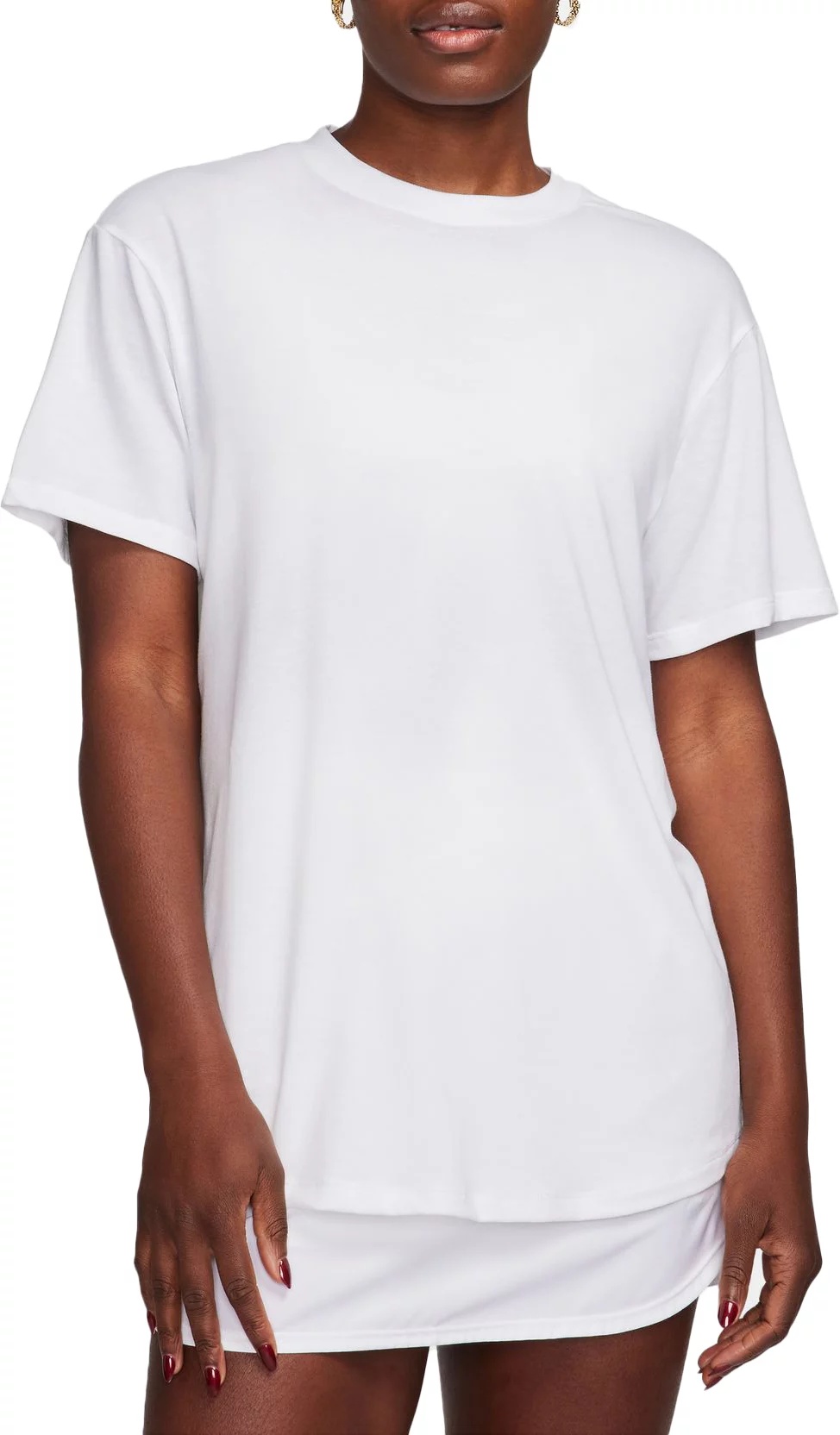 Up for a workout or down to chill, this Nike One Relaxed top is ready for whatever you are. Slightly textured, incredibly lightweight jersey fabric dries quickly and drapes you in comfort that goes with any activity. A loose, roomy fit and extended length help keep you covered and cozy from your morning stroll to your evening wind-down—and at all the stops in between. Fit & Design: Loose fit: roomy and relaxed Fits large; we recommend ordering a size down A ribbed neckline enhances the favorite-tee feeling and helps keep the top in place while you move A longer length is easy to tie up and customize for looks that go with everything you do in a day Nike Dri-FIT technology moves sweat away from your skin for quicker evaporation, helping you stay dry and comfortable Curved hem helps keep you covered as you move Reflective logo at center back