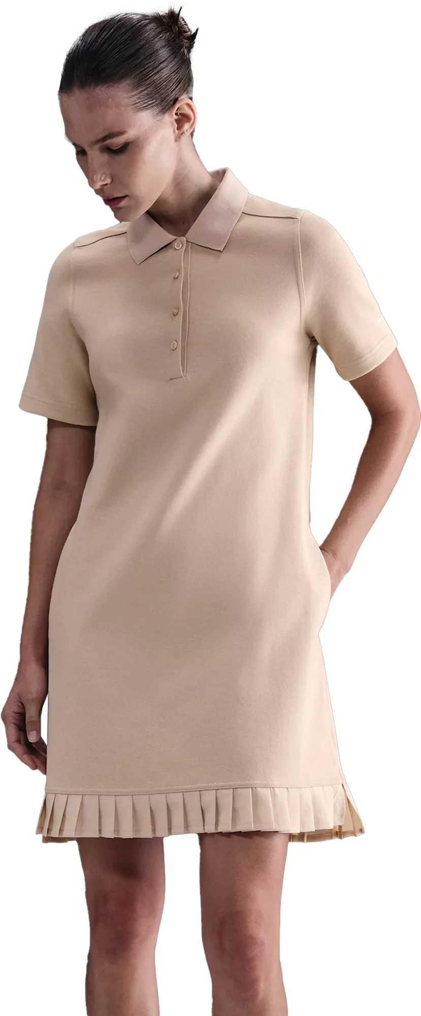 Level up your course outfit. This polo dress is crafted in midweight, breathable pique fabric and finished with a pleated hem so you can move with comfort and flair. Fit & Design: Short sleeve dress Collared 4-button placket Midweight, breathable pique fabric Pleated hem Features Nike Golf logo on back Additional Details: Machine wash