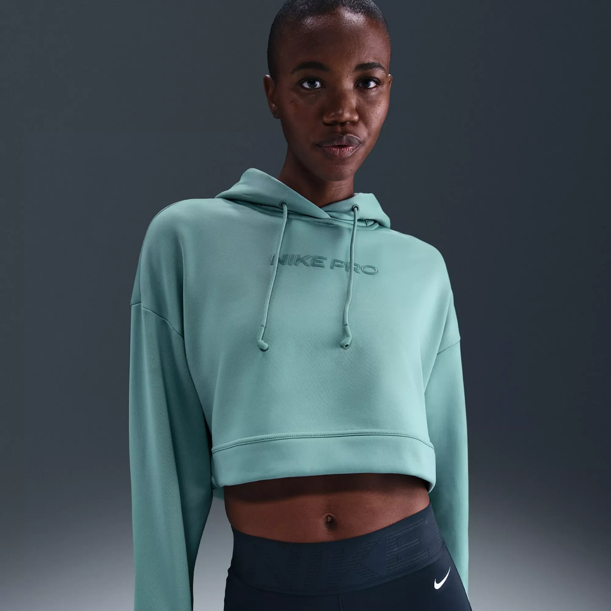 Warm up and work out in this spacious, heat-regulating hoodie. Soft and stretchy fabric feels cozy thanks to its supersmooth face on the outside and soft brushed face on the inside. Silicon drawcord tips provide a place to hold your earbuds. Fit & Design: Oversized fit: exaggerated and spacious Inspired by pump covers, the Nike Pro elastic on the back hem pulls up for ventilation and style Its specially designed drawcord with silicone holders at the ends can store certain earbuds Swoosh logo on sleeve Nike Pro branding at chest Thumbholes on sleeves Technology: Nike Therma-FIT technology helps manage your body’s natural heat to help keep you warm in cold-weather conditions Additional Details: Made from sustainable materials
