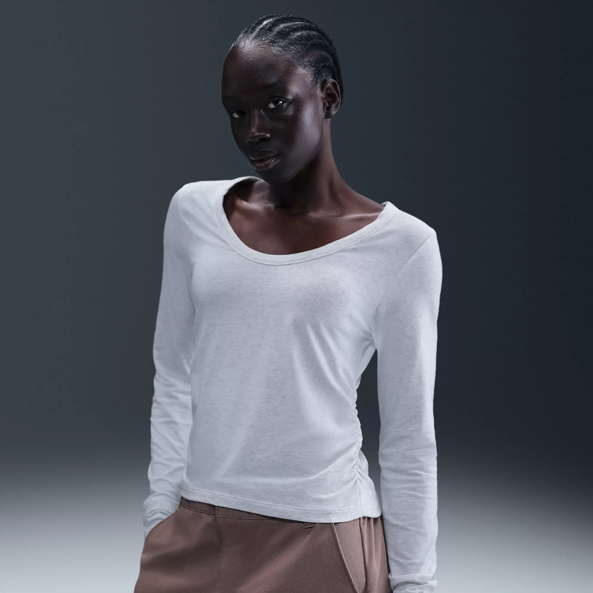 Ruched sides elevate this simple top. It's made with smooth jersey fabric that's stretchy with a slight drape, making it perfect for everyday wear. Fit & Design: Tight fit: snug and form-fitting Swoosh logo at center chest Stretchy, smooth jersey fabrication Ruched sides