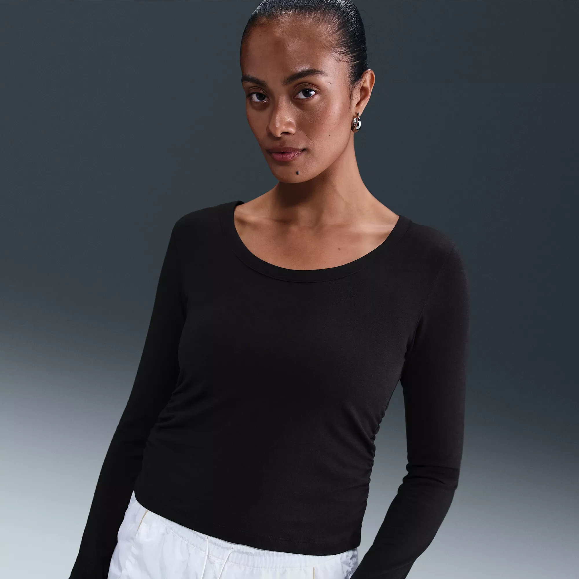 Ruched sides elevate this simple top. It's made with smooth jersey fabric that's stretchy with a slight drape, making it perfect for everyday wear. Fit & Design: Tight fit: snug and form-fitting Swoosh logo at center chest Stretchy, smooth jersey fabrication Ruched sides