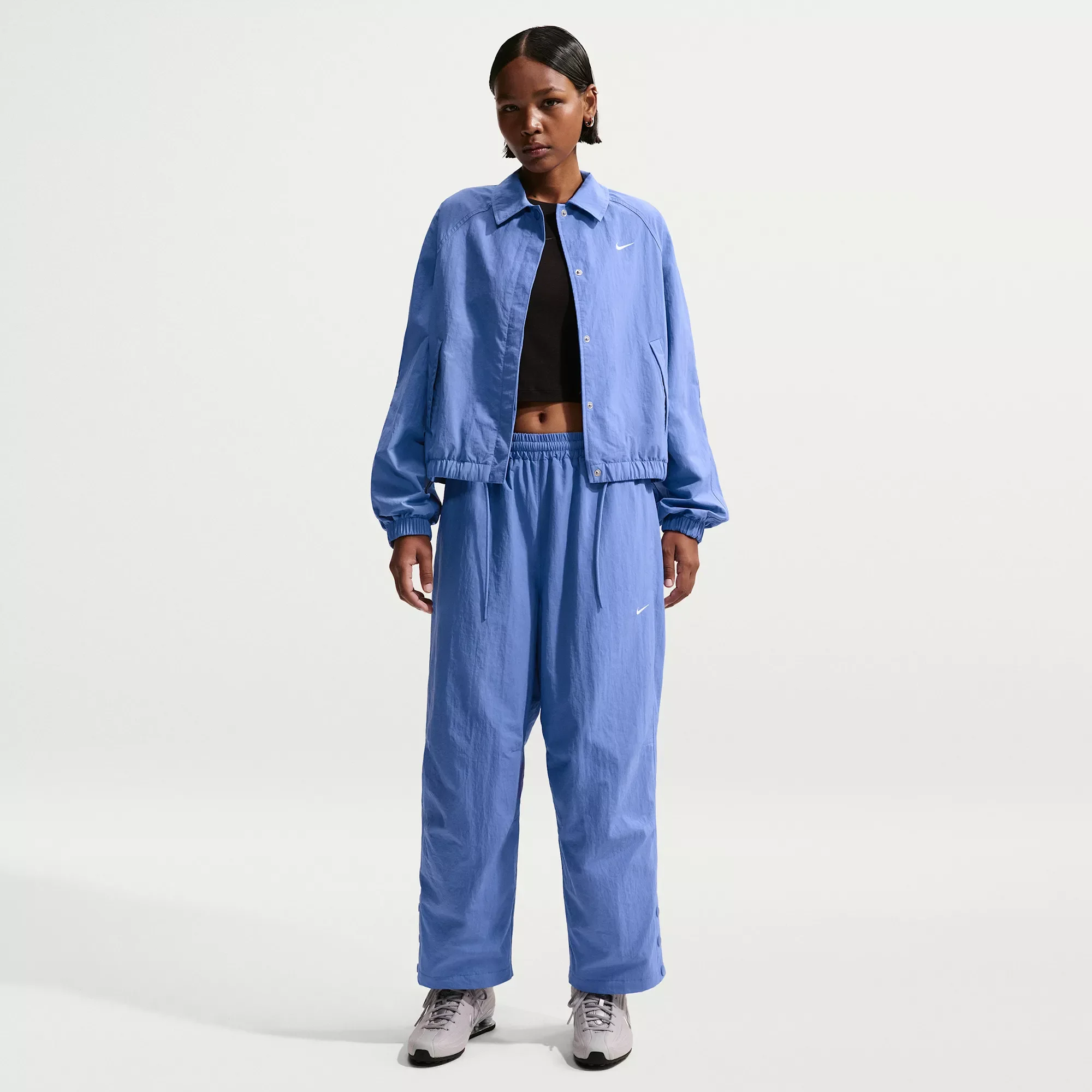 Classic sport style gets a modern twist. These taffeta pants have a voluminous fit and slightly cropped length designed to hit at your ankles. Snaps at the cuffs and articulation at the knees add a polished finish. Fit & Design: Oversized fit: exaggerated and spacious Elastic waistband with drawcord Hand pockets Embroidered logo