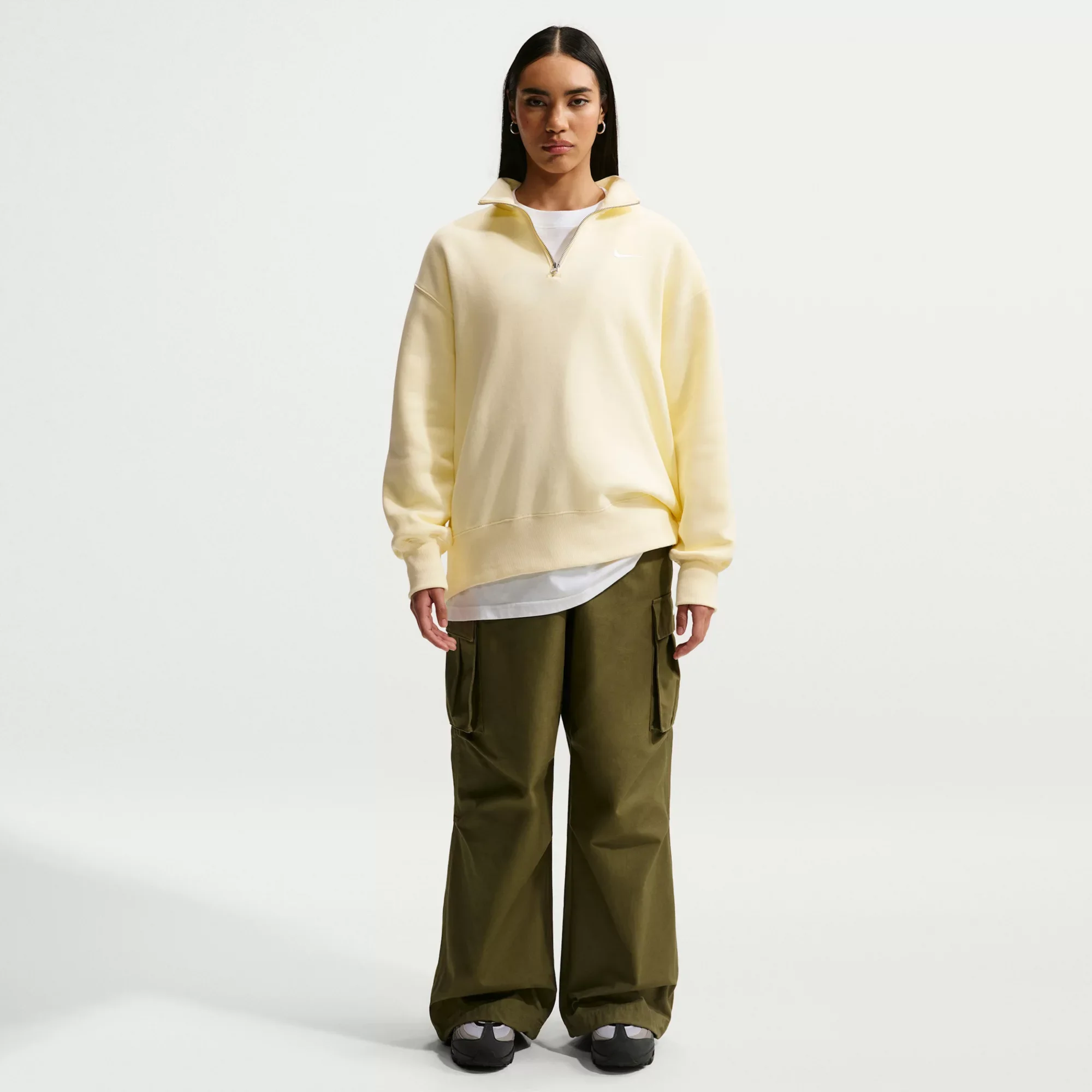 This cozy fleece 1/4-zip sweatshirt feels extra soft on the inside and smooth on the outside. Dropped shoulders and extra-wide ribbing enhance the oversized, extra-long look. Fit & Design: Oversized fit: exaggerated and spacious Embroidered Swoosh logo on left chest 1/4 zip Dropped shoulders Extra-long length