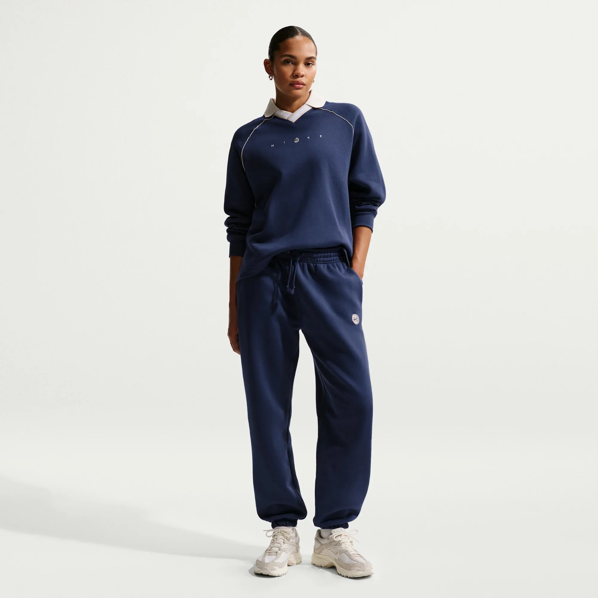 These pants are crafted with midweight brushed fleece that's extra soft on the inside and smooth on the outside. An extra roomy fit, cinched ankles and piping details make a look that's perfectly slouchy yet put-together. Fit & Design: Oversized fit: exaggerated and spacious Full length: hits below ankle Embroidered graphic Back patch pocket Hand pockets Tall elastic waistband with drawcord