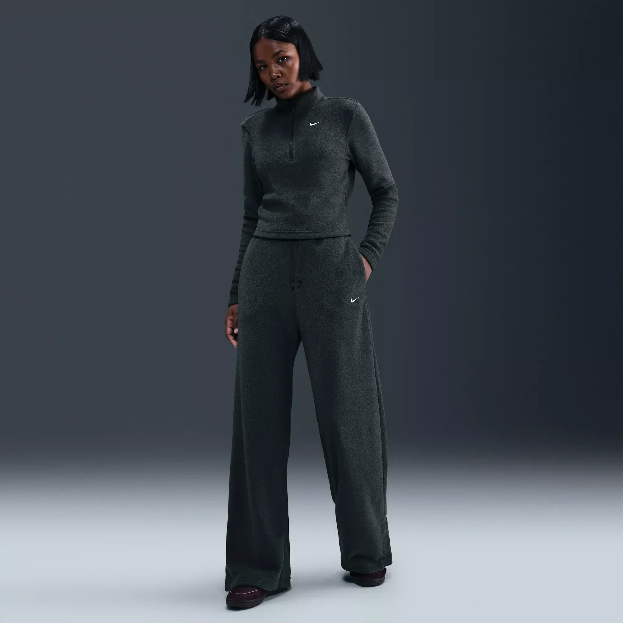 Grounded in style, comfort and versatility, meet Nike's take on luxury loungewear. Textured fleece makes these high-waisted pants cozy enough to wear around the house yet elevated enough to wear out in the city. Meanwhile, extra room throughout the legs lets you relax to the max. Fit & Design Standard fit: easy and traditional Full length: hits below ankle Tall, ribbed waistband with drawcord gives you a comfortable fit Side pockets hold hands and essentials Split hems make the pant legs puddle over your shoes Structured yet relaxed, textured midweight fleece feels extra cozy and gives you the best of both worlds Additional Details Machine wash
