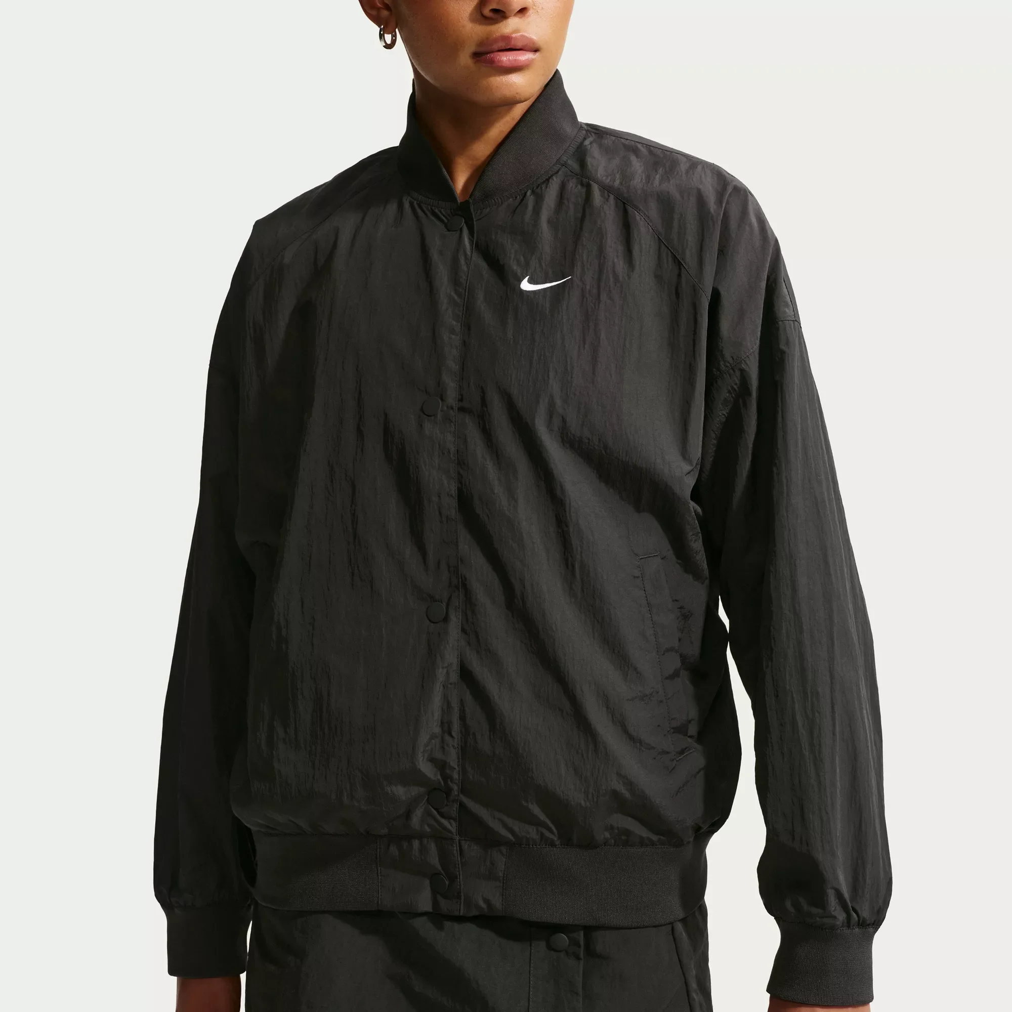 Fit & Design: Oversized fit Pockets Ribbed tapered neck band Ribbed cuffs and hem Embroidered Swoosh logo Lightweight woven taffeta Snap closure