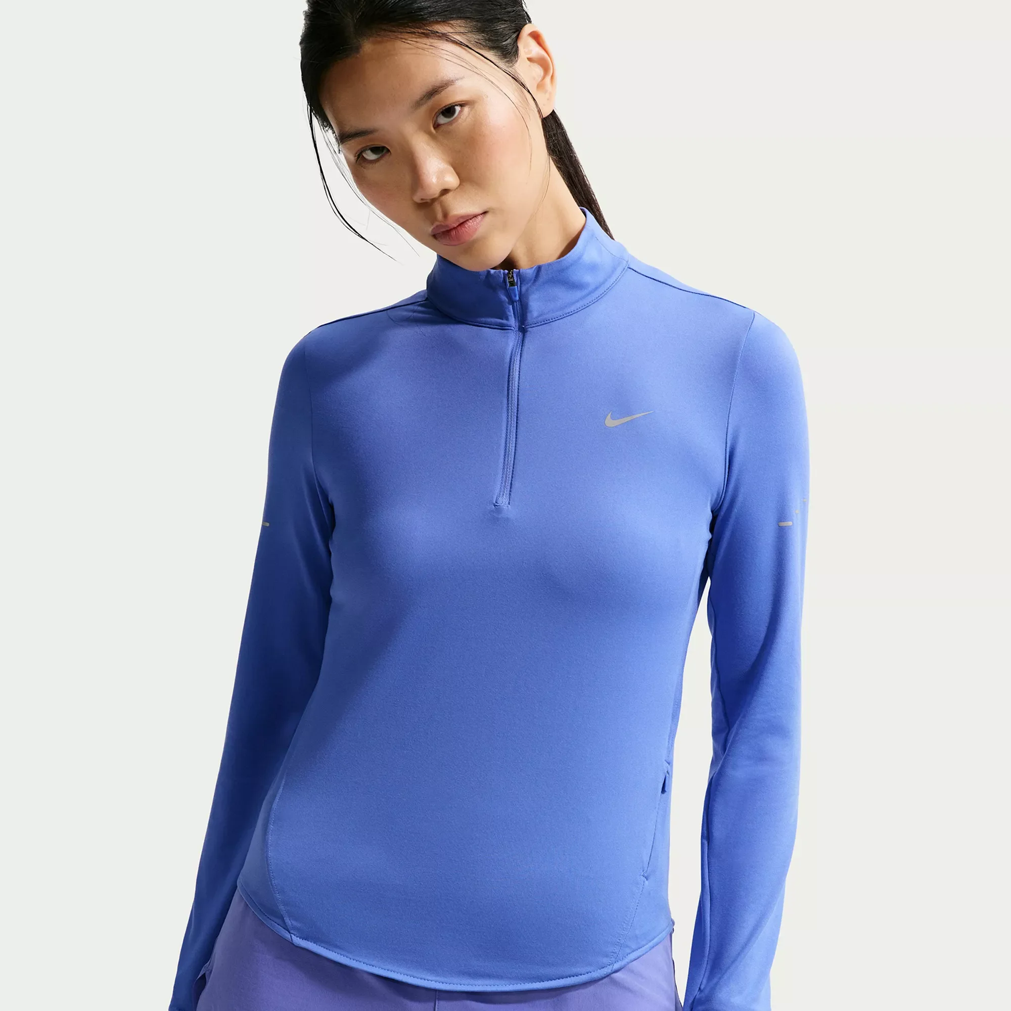 Using insights from runners like you, we prioritized functionality to refresh our Swift essentials. This lightweight mid layer has been designed to help reduce chafing. It's soft, sweat-wicking and helps block out UV rays so you can focus on your miles, and nothing else. Fit & Design: Regular fit women’s running pullover The mock neck provides additional coverage for your neck when fully zipped, then helps vent heat when unzipped 1/4-length zipper with guard The top is tapered around the waist so that layering with other pieces is easier The curved hem helps keep you covered through your stride Modified raglan sleeves are designed to help reduce underarm chafing and allow for a wider range of motion Thumbholes let you extend your coverage and help hold the sleeves in place Watch windows on either sleeve make it easy to check time A zip pocket on the left side seam fits items like earbuds, a key or a card Reflective Swoosh logo on left chest Reflective graphics on sleeves and back Technology: Nike Dri-FIT technology moves sweat away from your skin for quicker evaporation, helping you stay dry and comfortable Additional Details: This product provides UVA and UVB protection from the sun only in the areas covered by the garment. To protect exposed areas, the use of good quality sunscreen is recommended Not intended for use as Personal Protective Equipment (PPE) Machine wash
