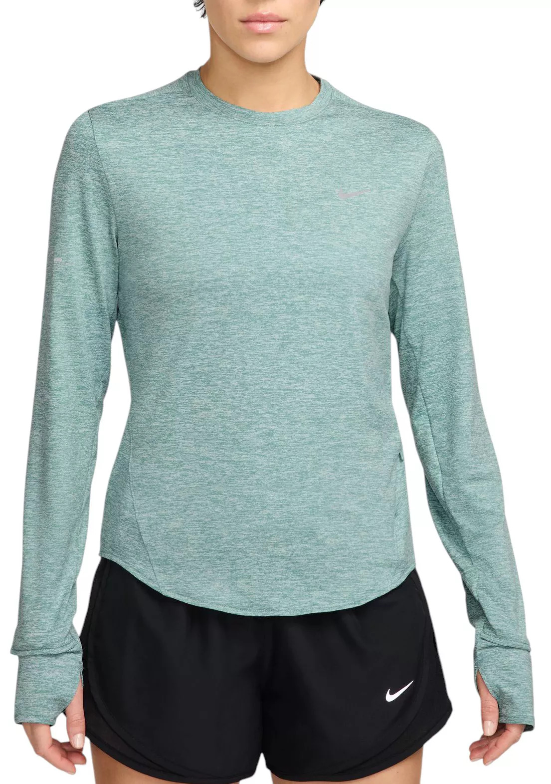 This lightweight top has been designed to help reduce chafing. It's soft, sweat-wicking and helps block out UV rays so you can focus on your miles, and nothing else. Fit & Design: Regular fit shirt Modified raglan sleeves are designed to help reduce underarm chafing and allow for a wider range of motion Tapered around the waist so that layering with other pieces is easier Curved hem helps keep you covered through your stride Thumbholes let you extend your coverage and help hold the sleeves in place Watch windows on either sleeve make it easy to check time Zip pocket on the left side seam fits items like earbuds, a key or a card Reflective Swoosh logo on left chest Reflective graphics on sleeves and back Technology: Nike Dri-FIT technology moves sweat away from your skin for quicker evaporation, helping you stay dry and comfortable Provides UVA and UVB protection from the sun only in the areas covered by the garment Additional Details: Not intended for use as Personal Protective Equipment (PPE) To protect exposed areas, the use of good quality sunscreen is recommended