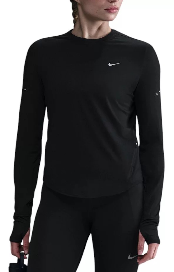 This lightweight top has been designed to help reduce chafing. It's soft, sweat-wicking and helps block out UV rays so you can focus on your miles, and nothing else. Fit & Design: Regular fit shirt Modified raglan sleeves are designed to help reduce underarm chafing and allow for a wider range of motion Tapered around the waist so that layering with other pieces is easier Curved hem helps keep you covered through your stride Thumbholes let you extend your coverage and help hold the sleeves in place Watch windows on either sleeve make it easy to check time Zip pocket on the left side seam fits items like earbuds, a key or a card Reflective Swoosh logo on left chest Reflective graphics on sleeves and back Technology: Nike Dri-FIT technology moves sweat away from your skin for quicker evaporation, helping you stay dry and comfortable Provides UVA and UVB protection from the sun only in the areas covered by the garment Additional Details: Not intended for use as Personal Protective Equipment (PPE) To protect exposed areas, the use of good quality sunscreen is recommended