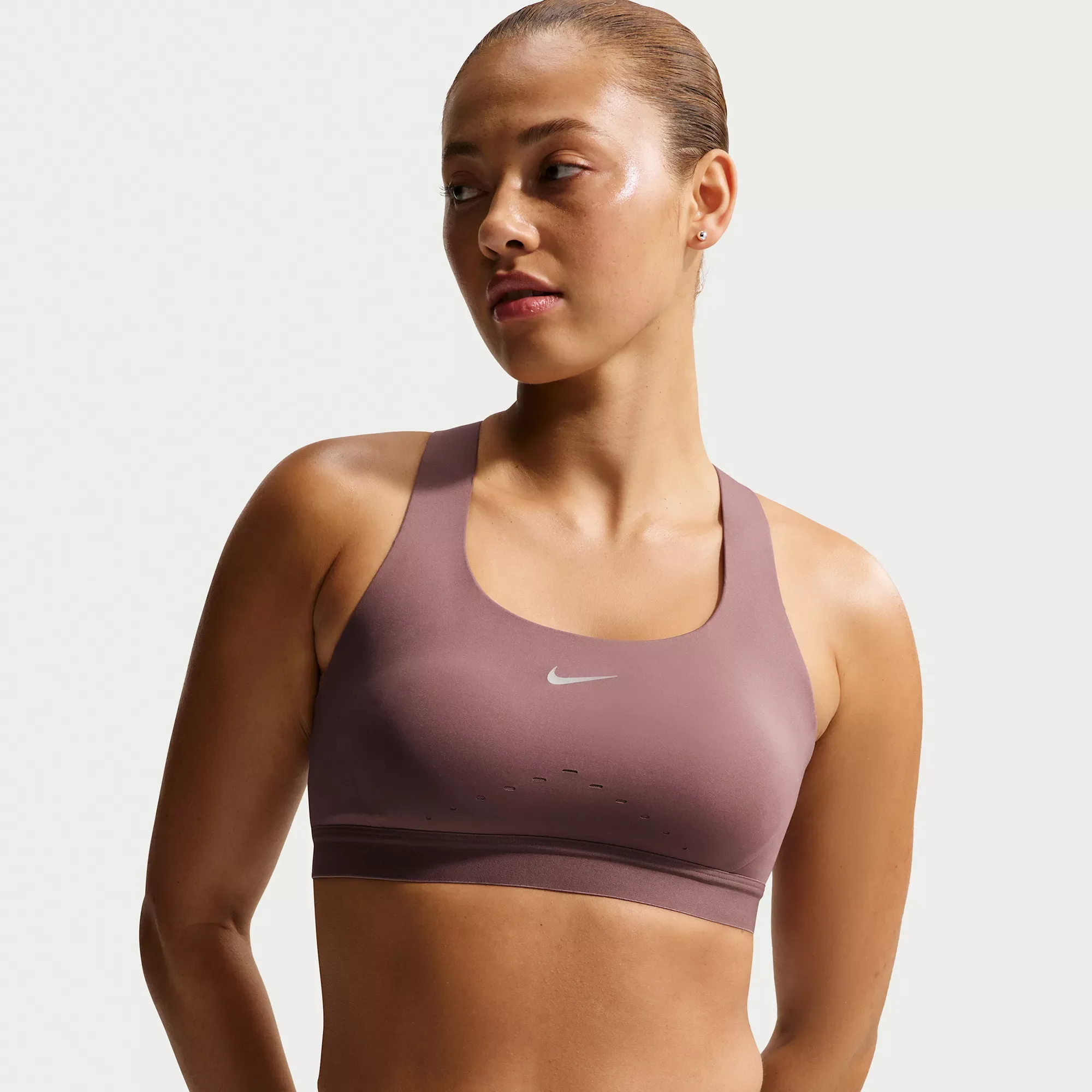 This high-support Swift bra is designed to go the distance. Incredibly lightweight and smooth, it comfortably locks you in and helps minimize motion from all sides. Sweat-wicking fabric combines with a quick-drying chest band to help reduce chafing and improve comfort mile after mile after mile. Fit & Design: A smooth outer layer gives you a compressive, locked-in feel Molded mesh side panels that hold you in place from all sides The quick-drying chest band is designed to stay in place as you run to help reduce chafing A stitch-free construction around the arms to give you an extra smooth feel The racerback design allows for unrestricted movement Perforations on the front and back offer breathability in high-sweat areas Reflective details on front and back Technology: Nike Dri-FIT technology moves sweat away from your skin for quicker evaporation, helping you stay dry and comfortable