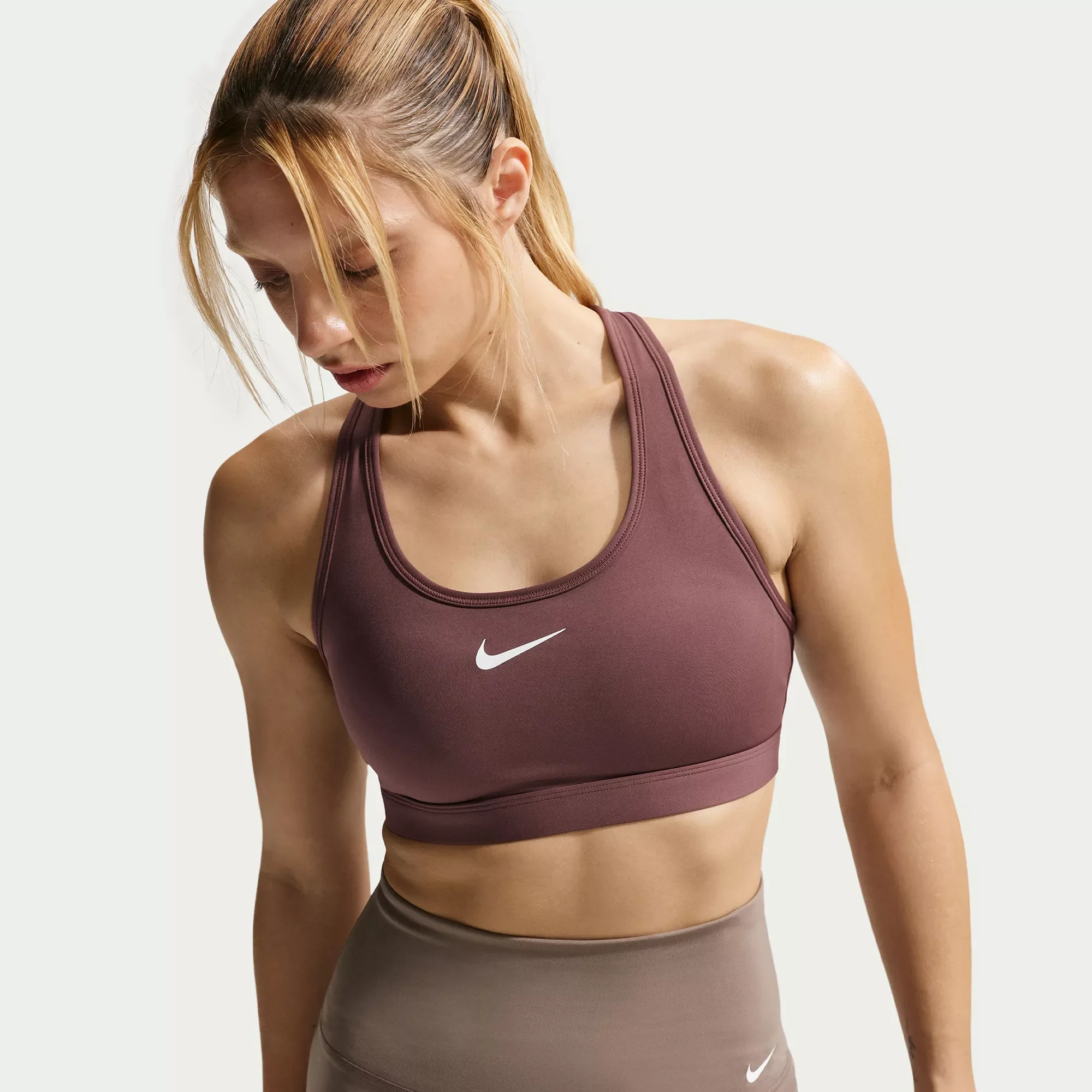 You're on the move. Your padding shouldn't be. This Swoosh bra's sewn-in pads stay in place so you can work hard without worrying about them shifting or folding. Great for training workouts and dance classes, medium support gives you a snug hold that helps keep everything in place. Plus, sweat-wicking, adaptive material quickly recovers its shape so you can stay comfortable throughout your workout. Fit & Design: Tight fit: snug and form-fitting Medium support: feels like a snug hold to keep everything in place Mesh lining to help keep you cool Lightweight, adaptive fabric feels like a second skin for superior comfort and support Provides a snug hold and subtle shaping Super-stretchy fibers make for an easy on/off experience Nike Dri-FIT technology moves sweat away from your skin for quicker evaporation, helping you stay dry and comfortable