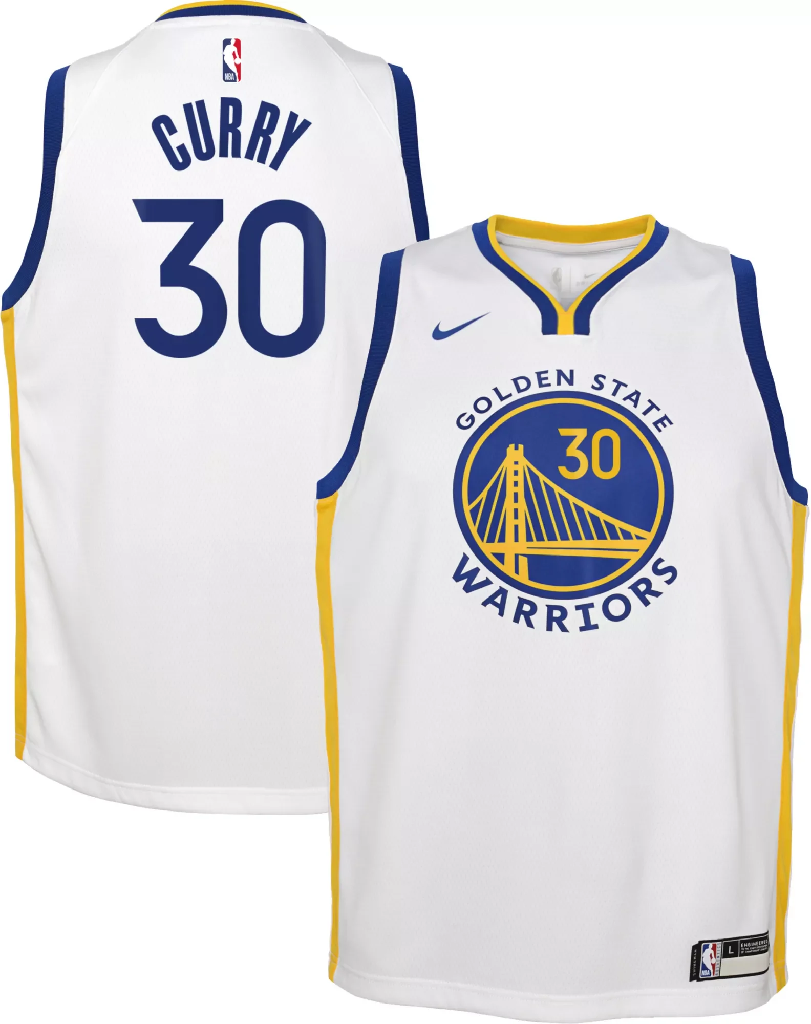 Have you little baller rep his or her squad and cheer on their favorite star with the Nike® Golden State Warriors Steph Curry #30 Swingman Jersey featuring Dri-FIT® technology. On-Court Design NBA® Swingman jersey Classic construction, tailored fit Dri-FIT® technology Team Details Heat applied twill team and player details Official NBA® logo Swoosh® design trademark Additional Details Officially licensed by the NBA®
