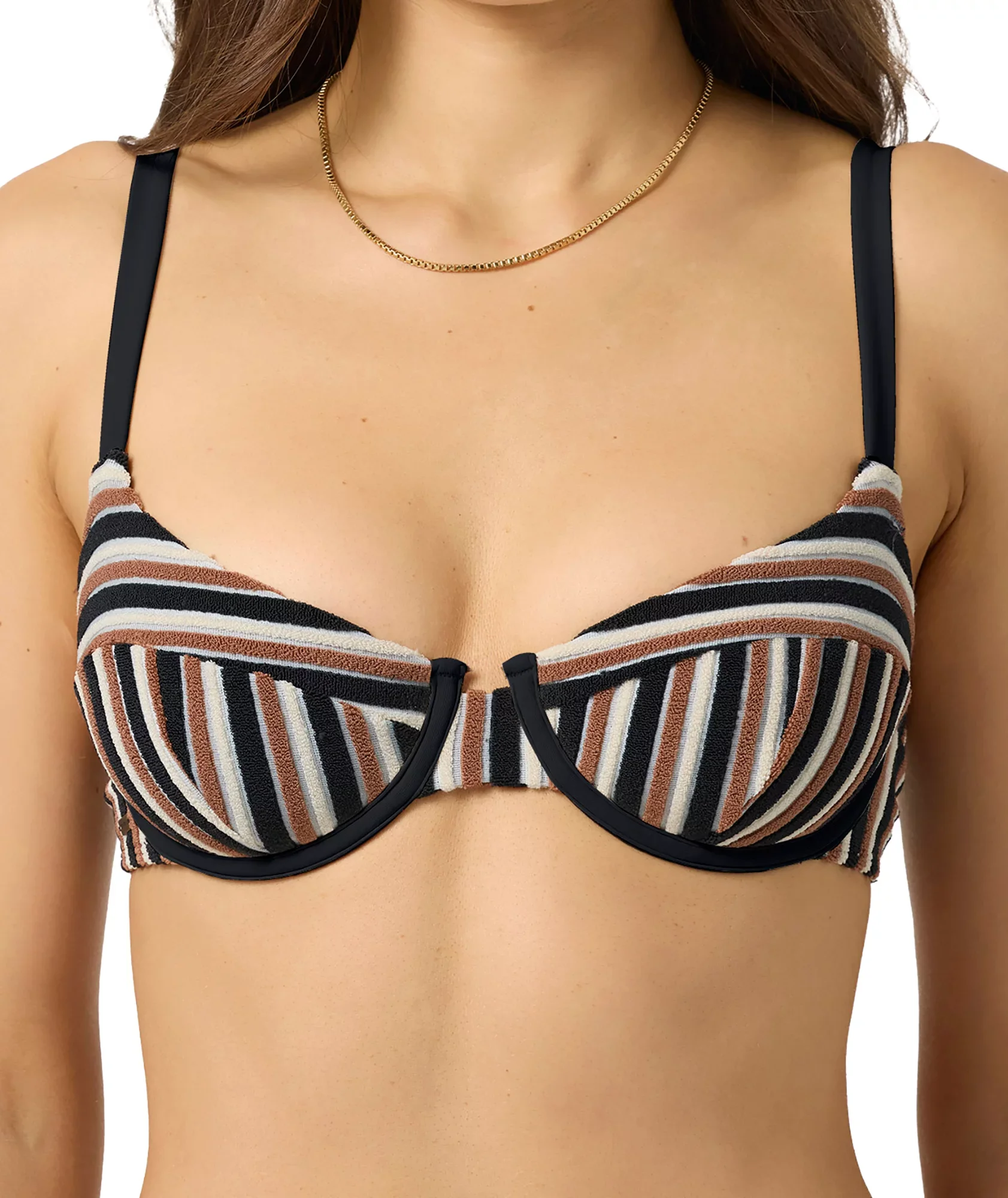 Fit & Design Textured stripe bra bikini top Underwire provides worry-free support Adjustable contrast straps ensure a precise fit Removeable cups deliver customizable coverage Seaming detail adds a subtle touch of style Additional Details