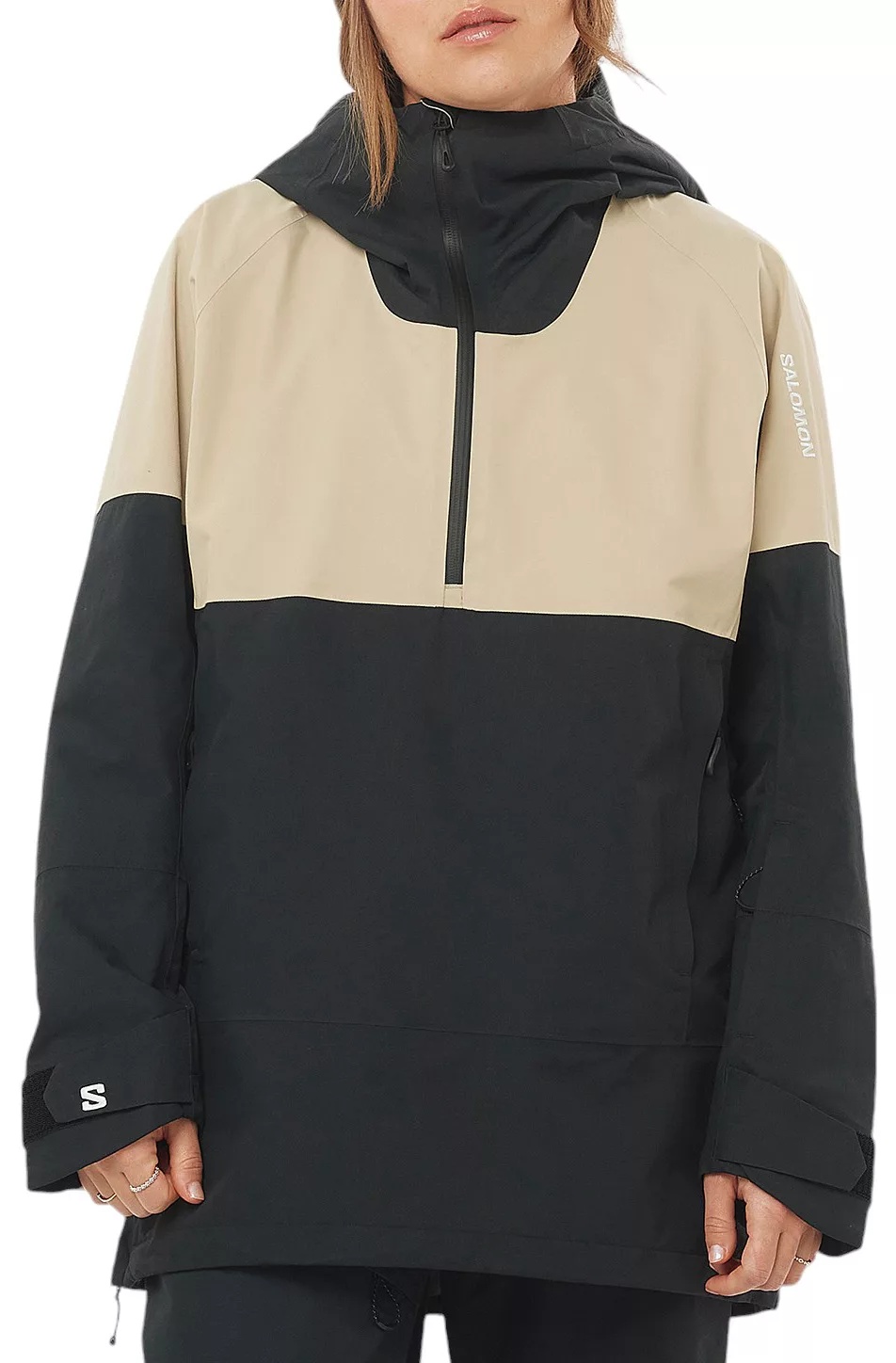 Skiers and snowboarders now have a new favorite for the slopes. Full weather protection and breathable temperature regulation keeps you focused on the terrain, not discomfort. Fit & Design Regular fit anorak The helmet-compatible hood fits over your protective gear with adjustments to fit your head Full side zip opening alongside a water repellent 1/2 zip at front that allows for easy access and temperature regulation Salomon air vents are easy to open, maximizing air flow One kangaroo pocket and lift pass pocket with goggle wipe in sleeve provide a warm place for hands and valuables Simple cuff adjustments fit to your gloves for a tight seal The integrated draw cord adjustment tightens the bottom hem for better protection against the elements An integrated powder skirt prevents snow from entering in your jacket Fabric and membrane are bonded to one fabric Technology AdvancedSkin Dry 10K/10K protects you against rain, snow and wind, but allows moisture vapor to escape and keep you comfortable