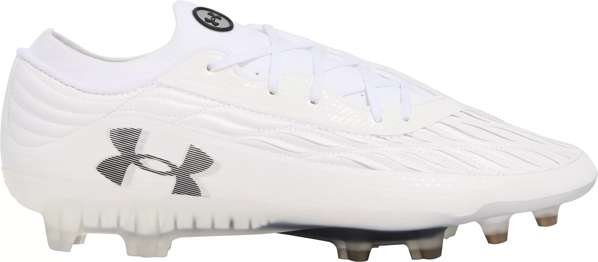 Design: UA Clone upper provides a truly customized fit, no matter your foot size Knit collar and tongue for a sock-like fit with premium internal foam for heel hold and added comfort 3D print for additional touch and control and silicone strike zone for maximum control when shooting Asymmetrical tongue allows for additional space on the medial side for control, passing and shooting An internal layer of flexible, auxetic material molds around the foot for a precise, glove-like fit and feel Traction & Durability: Lightweight soleplate with mixed stud control outsole for multi-directional movement Enhanced stud shape mitigates pressure and provides optimum traction