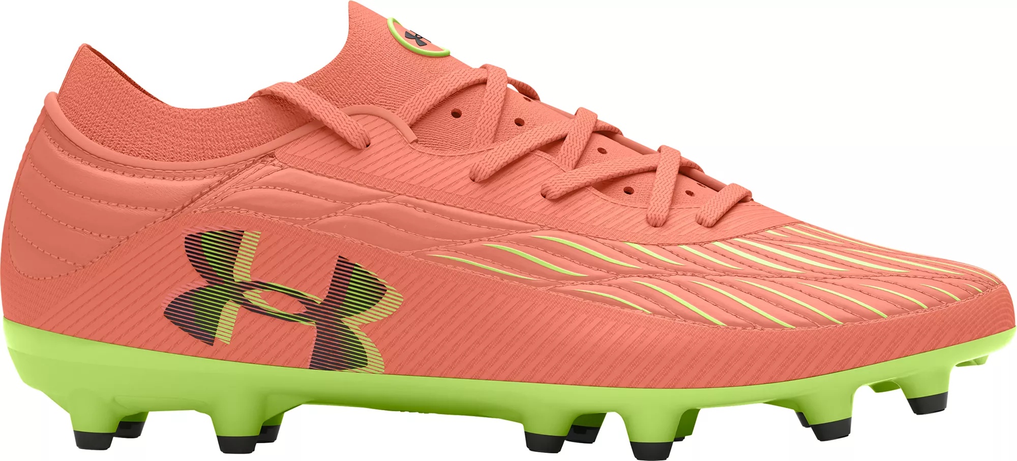 Design: UA Clone upper provides a truly customized fit, no matter your foot size Knit collar and tongue for a sock-like fit with premium internal foam for heel hold and added comfort 3D print for additional touch and control Asymmetrical tongue allows for additional space on the medial side for control, passing and shooting An internal layer of flexible, auxetic material molds around the foot for a precise, glove-like fit and feel Traction & Durability: Conical TPU studs enable quickness in all directions for enhanced agility and change of direction