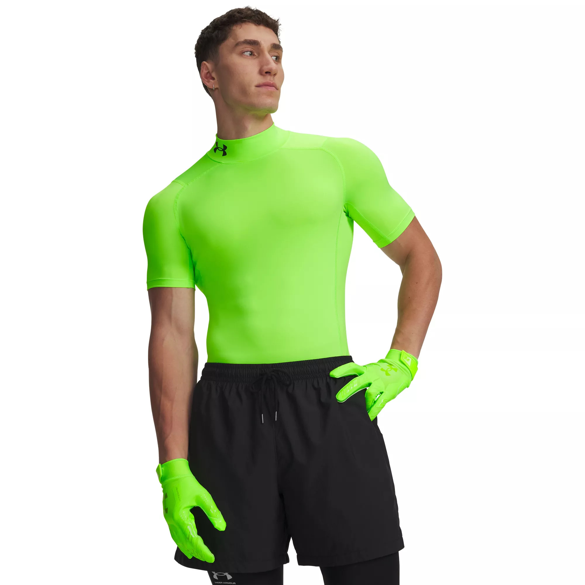 Fit & Design: Tight fit compression shirt Second-skin fit forms to your body 4-way stretch fabric moves with you effortlessly Mesh underarm and back panels provide strategic ventilation Ergonomic design keeps seams off high abrasion areas and increases durability Mock neckline offers added coverage Hybrid raglan sleeves enhance range of motion and comfort Write-in locker tag on back of neck lets you write your initials or number Technology: HeatGear® fabric wicks away sweat and dries quickly to keep you dry and comfortable Additional Details: Care instructions: Machine wash cold, inside out with like colors; use only non-chlorine bleach; tumble dry low; do not iron, use softeners, or dry clean