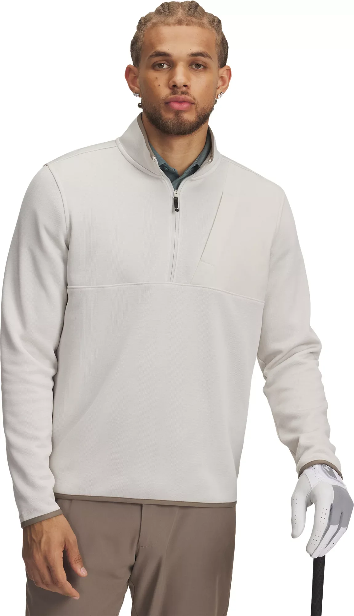 We combined the comfort and warmth of a sweater, the performance of our stretchy, lightweight fleece, and the rain protection of a jacket. You'll wear it all season. Fit & Design: Long sleeve Fuller cut for complete comfort Generous ½ zip front makes for easy layering SweaterFleece fabric with heathered look has a soft, brushed interior with stretch for complete mobility Angled, hidden zip chest pocket with woven panel for added durability Binding detail on cuffs, bottom hem & collar Built-in tee holder on wearer's right side Technology: UA Storm technology repels water without sacrificing breathability Additional Details: