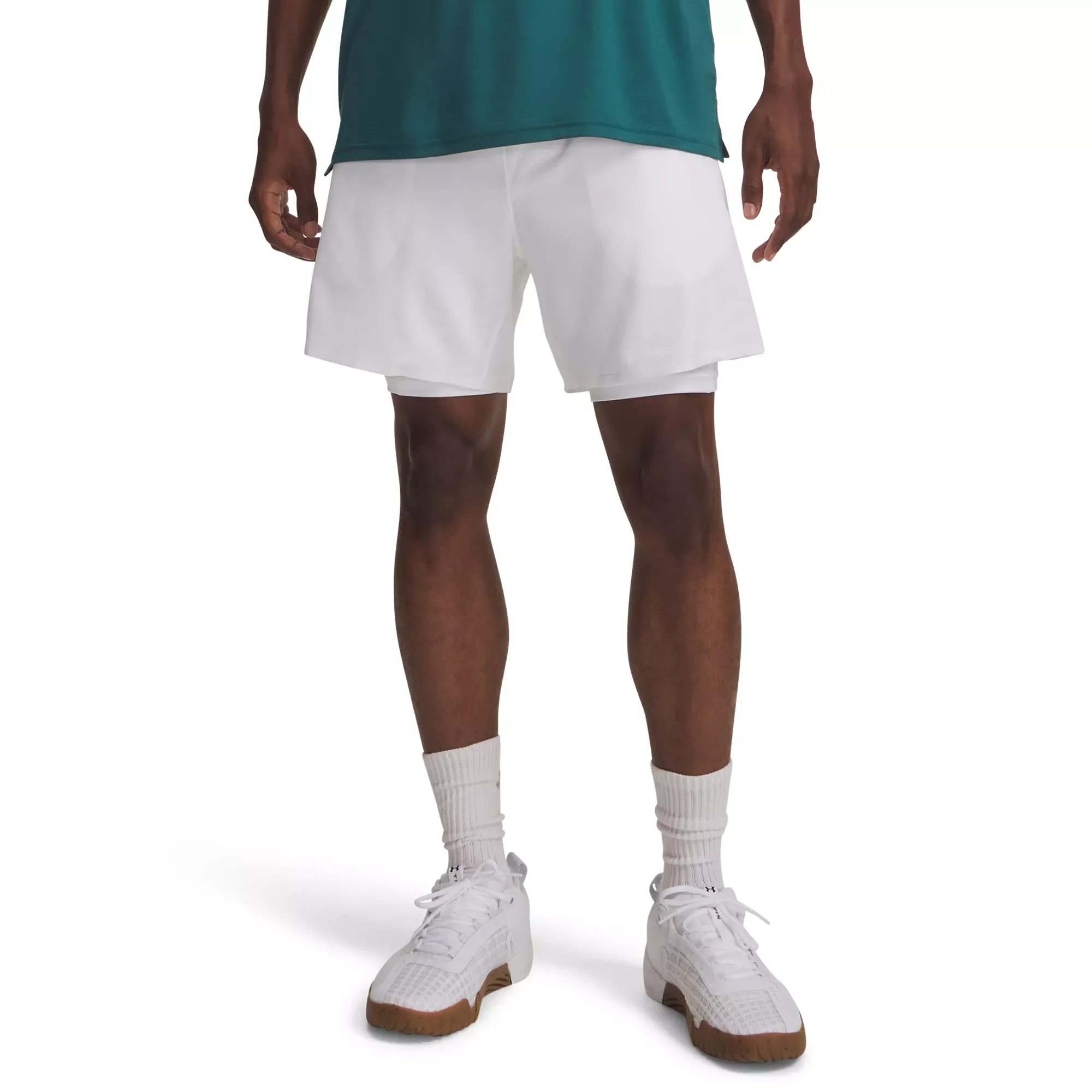 Fit & Design: Fitted New, lighter, and stretchier woven fabric for superior mobility and durability Built-in stretchy knit compression shorts for added coverage and support Updated elastic waistband with internal drawcord to help prevent rolling Open hand pockets with a secure, zip Strength Pocket™ on the right side Shaped, side-vent hem Laser perforated logo for better range of motion Additional Details: Inseam (outer shorts): 6" Inseam (liner shorts): 7.75" Imported
