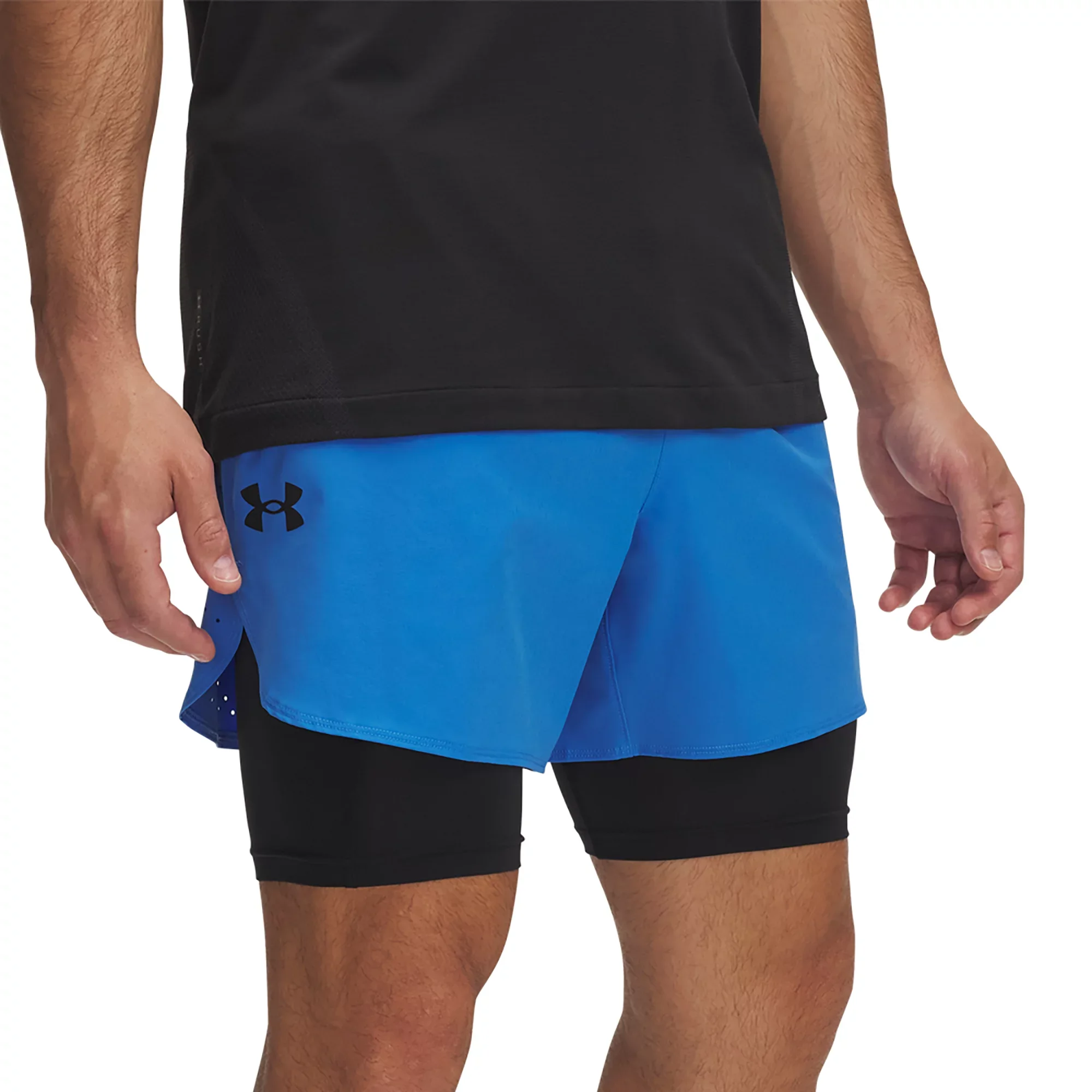 Fit & Design: Regular fit shorts Lightweight stretch-woven fabric provides superior mobility and durability Built-in knit compression shorts offer added coverage and support Mesh panels and laser perforations deliver strategic breathability Exposed elastic waistband with mesh ventilation and internal drawcord lets you adjust your fit Extended gusset provides enhanced mobility Open hand pockets let you stash your essentials Secure-zip Strength Pocket™ on right side keeps your valuables closeby Shaped, side-vent hem enables better range of motion Additional Details: Inseam (outer shorts): 5" Inseam (liner shorts): 8.75" Machine wash cold with like colors Tumble dry low Do not bleach Do not iron. Do not use softeners. Do not dry clean.