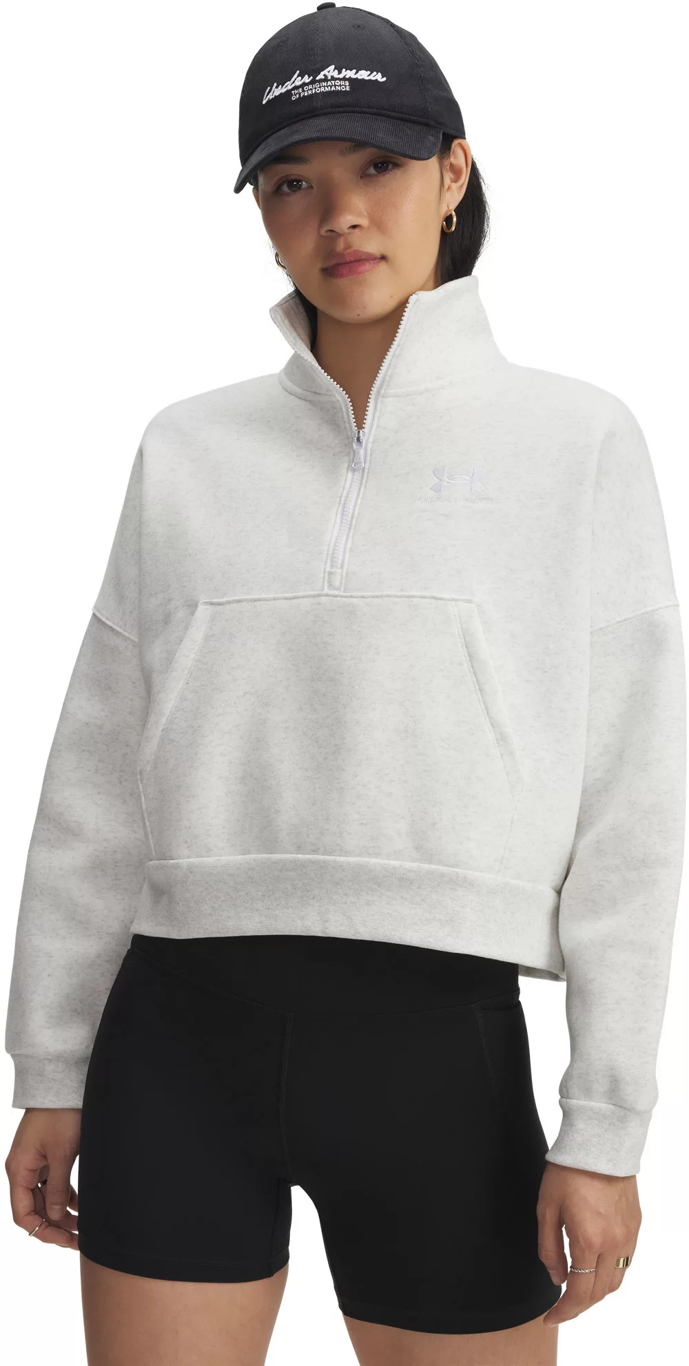 UA Icon Fleece has the feel of your favorite old school fleece with a clean, oversized fit that looks just as good with gym gear as it does with street clothes. Fit & Design: Front kangaroo pocket Ultra-soft, mid-weight cotton-blend fleece with brushed interior for extra warmth Generous ½ zip front makes for easy layering Drop hem shoulder for an oversized fit & feel Ribbed cuffs & bottom hem