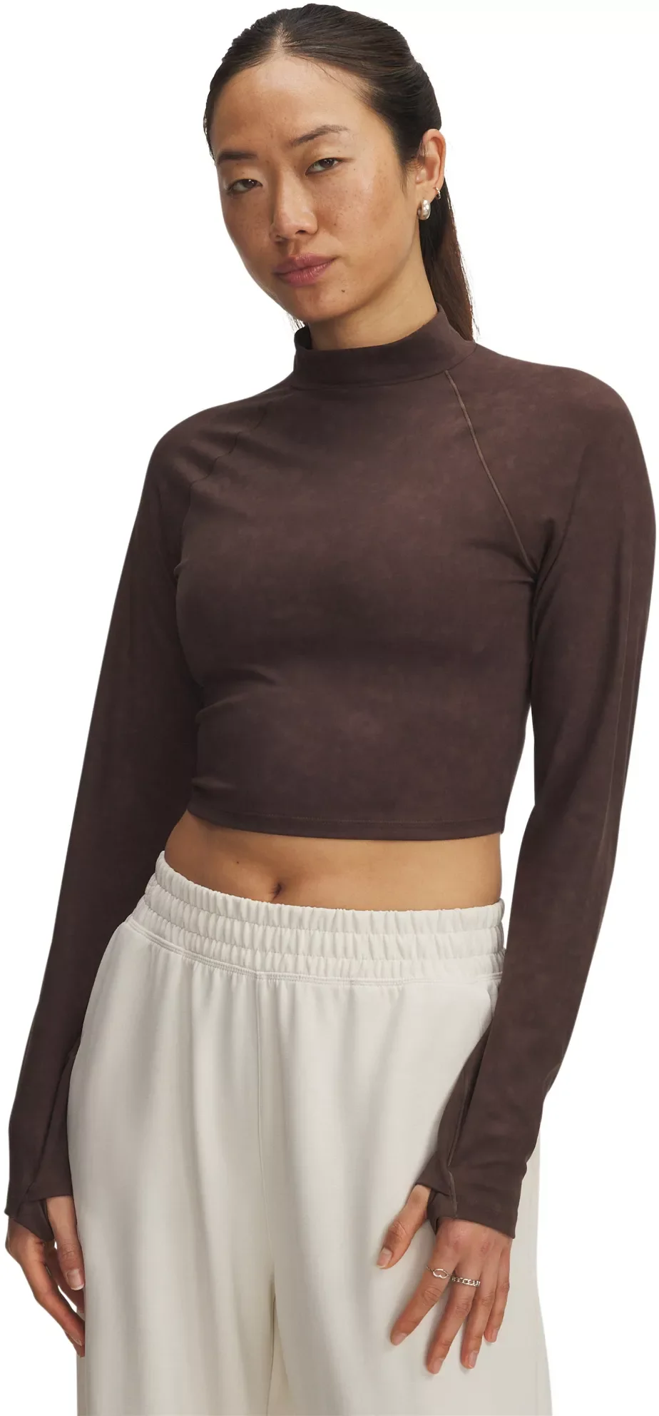 This top is built to flatter, with a cropped, body-hugging cut and super-soft fabric with a suede-like look. Fit & Design: Fitted: Streamlined fit that's not too tight or too loose Super-soft & stretchy performance knit with printed suede-effect visual delivers support & lasting comfort Material wicks sweat & dries really fast 4-way stretch material moves better in every direction Short mock neck collar for added coverage Built-in thumbholes help keep sleeves in place Raglan sleeves